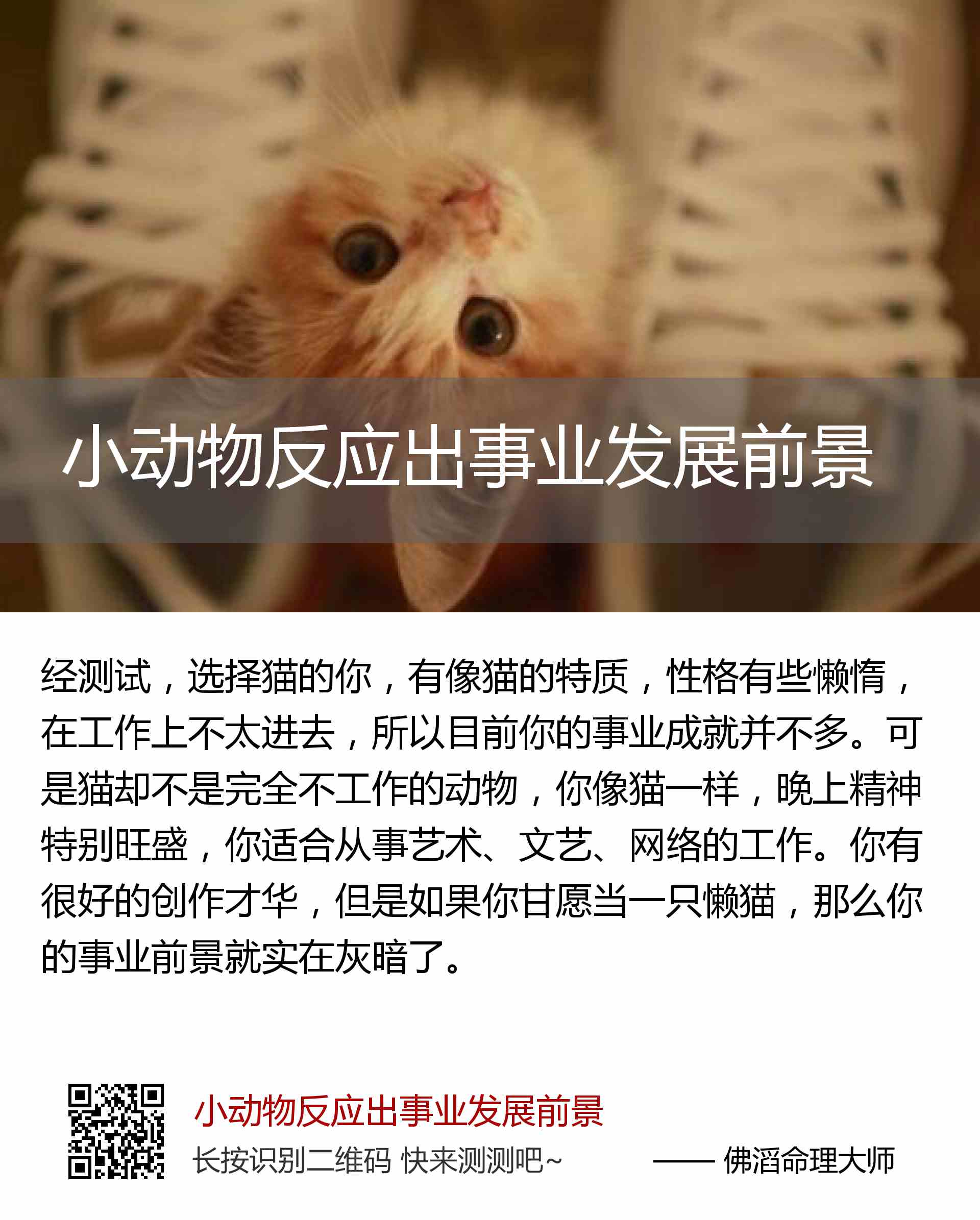 可是猫却不是完全不工作的动物,你像猫一样,晚上精神特别旺盛,你适合从事艺术、文艺、网络的工作。你有很好的创作才华,但是如果你甘愿当一只懒猫,那么你的事业前景就实在灰暗了。