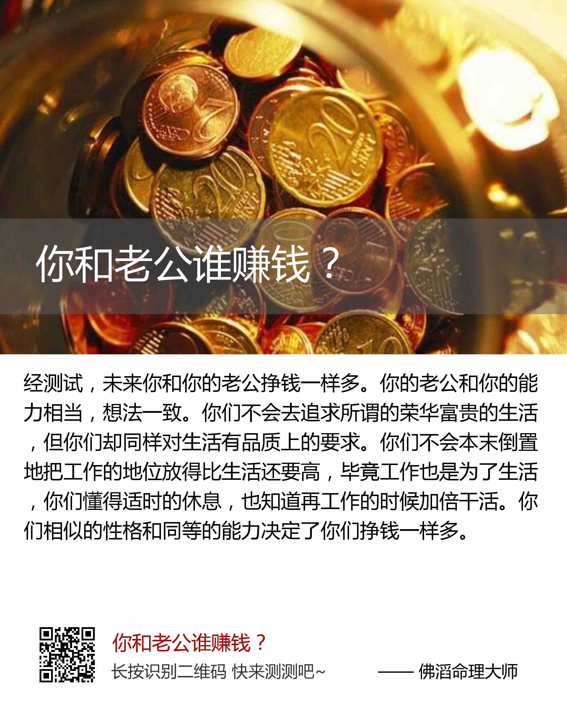 你的老公和你的能力相当,想法一致。你们不会去追求所谓的荣华富贵的生活,但你们却同样对生活有品质上的要求。你们不会本末倒置地把工作的地位放得比生活还要高,毕竟工作也是为了生活,你们懂得适时的休息,也知道再工作的时候加倍干活。你们相似的性格和同等的能力决定了你们挣钱一样多。