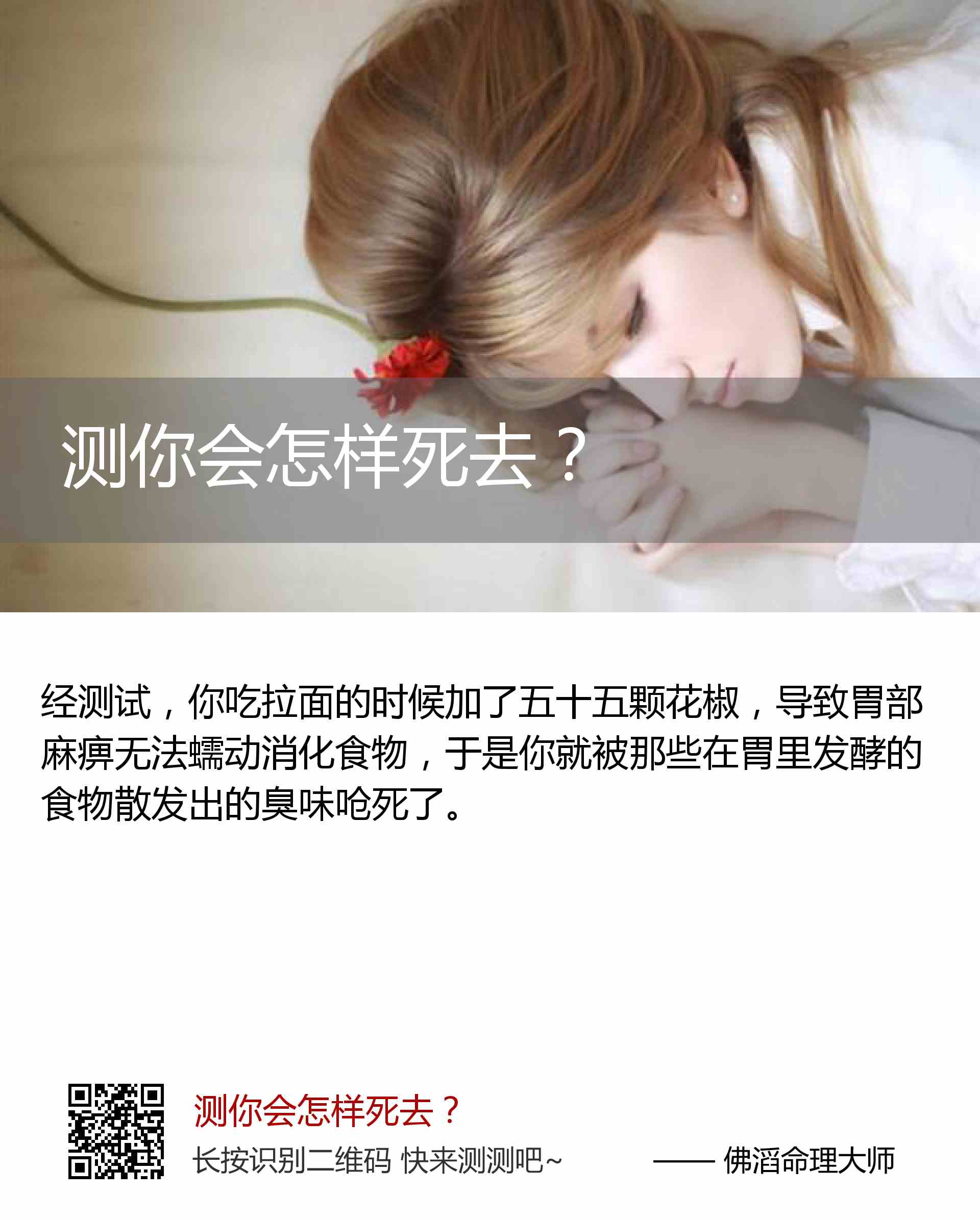 你吃拉面的时候加了五十五颗花椒,导致胃部麻痹无法蠕动消化食物,于是你就被那些在胃里发酵的食物散发出的臭味呛死了。