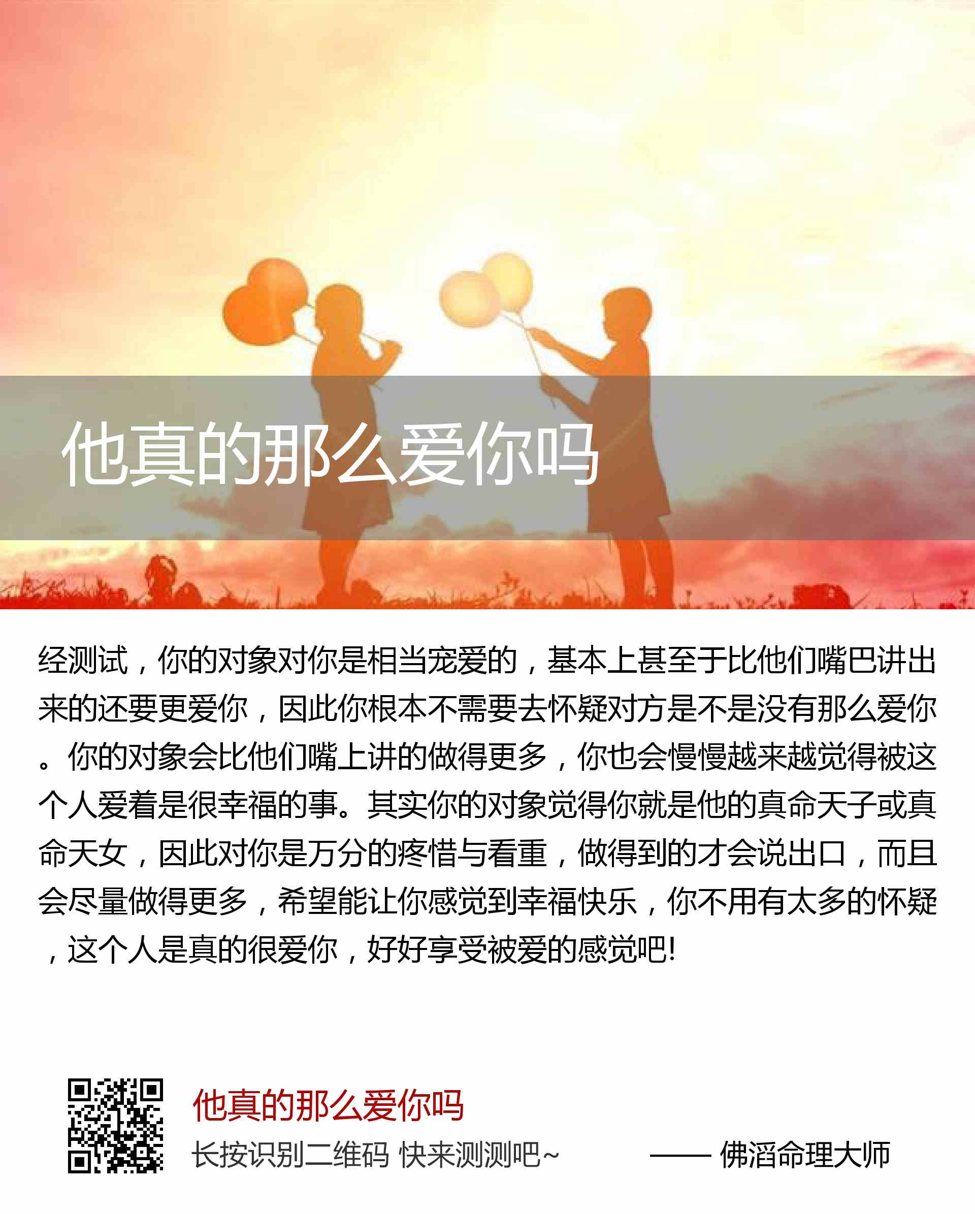 你的对象会比他们嘴上讲的做得更多,你也会慢慢越来越觉得被这个人爱着是很幸福的事。其实你的对象觉得你就是他的真命天子或真命天女,因此对你是万分的疼惜与看重,做得到的才会说出口,而且会尽量做得更多,希望能让你感觉到幸福快乐,你不用有太多的怀疑,这个人是真的很爱你,好好享受被爱的感觉吧!