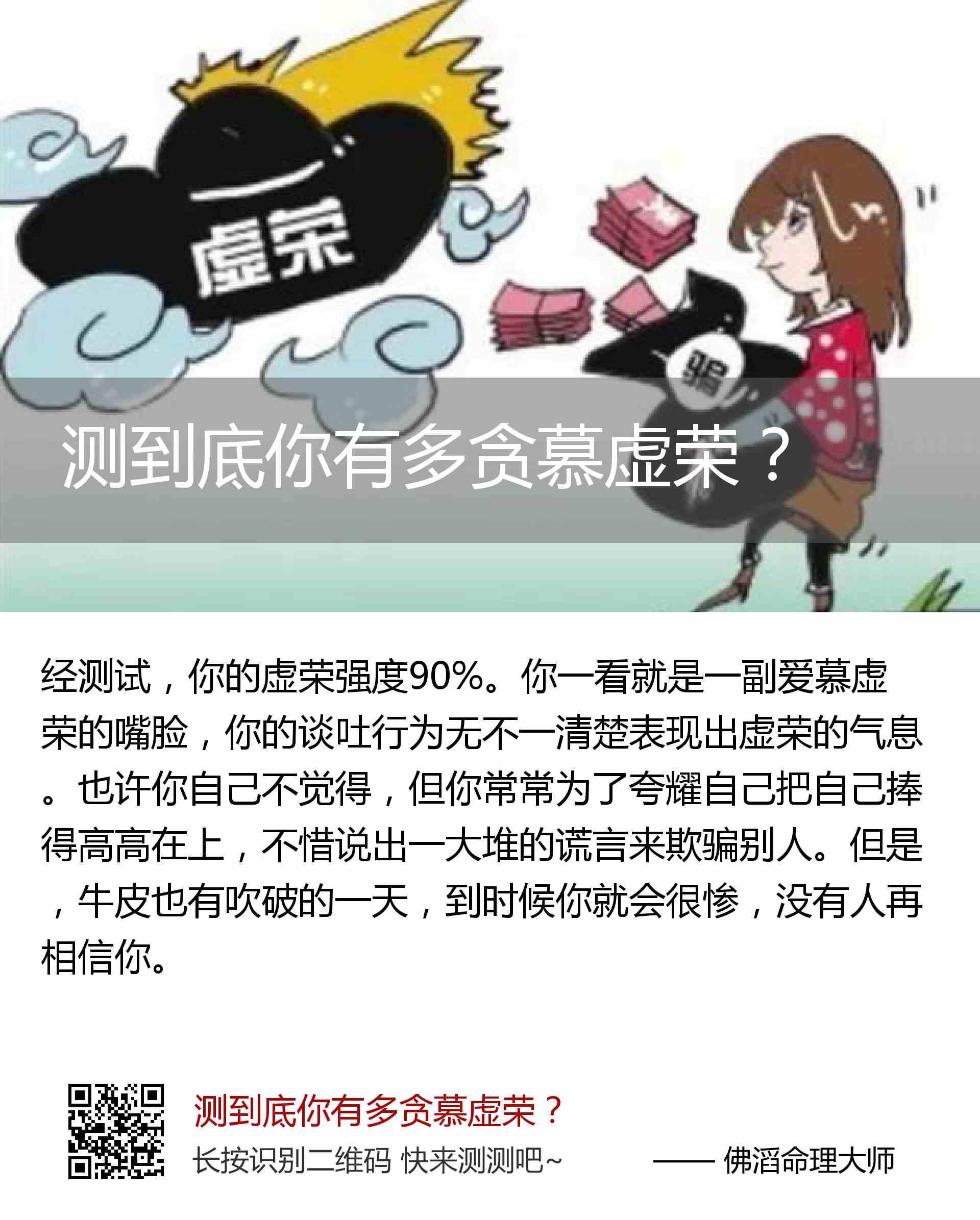 你一看就是一副爱慕虚荣的嘴脸,你的谈吐行为无不一清楚表现出虚荣的气息。也许你自己不觉得,但你常常为了夸耀自己把自己捧得高高在上,不惜说出一大堆的谎言来欺骗别人。但是,牛皮也有吹破的一天,到时候你就会很惨,没有人再相信你。