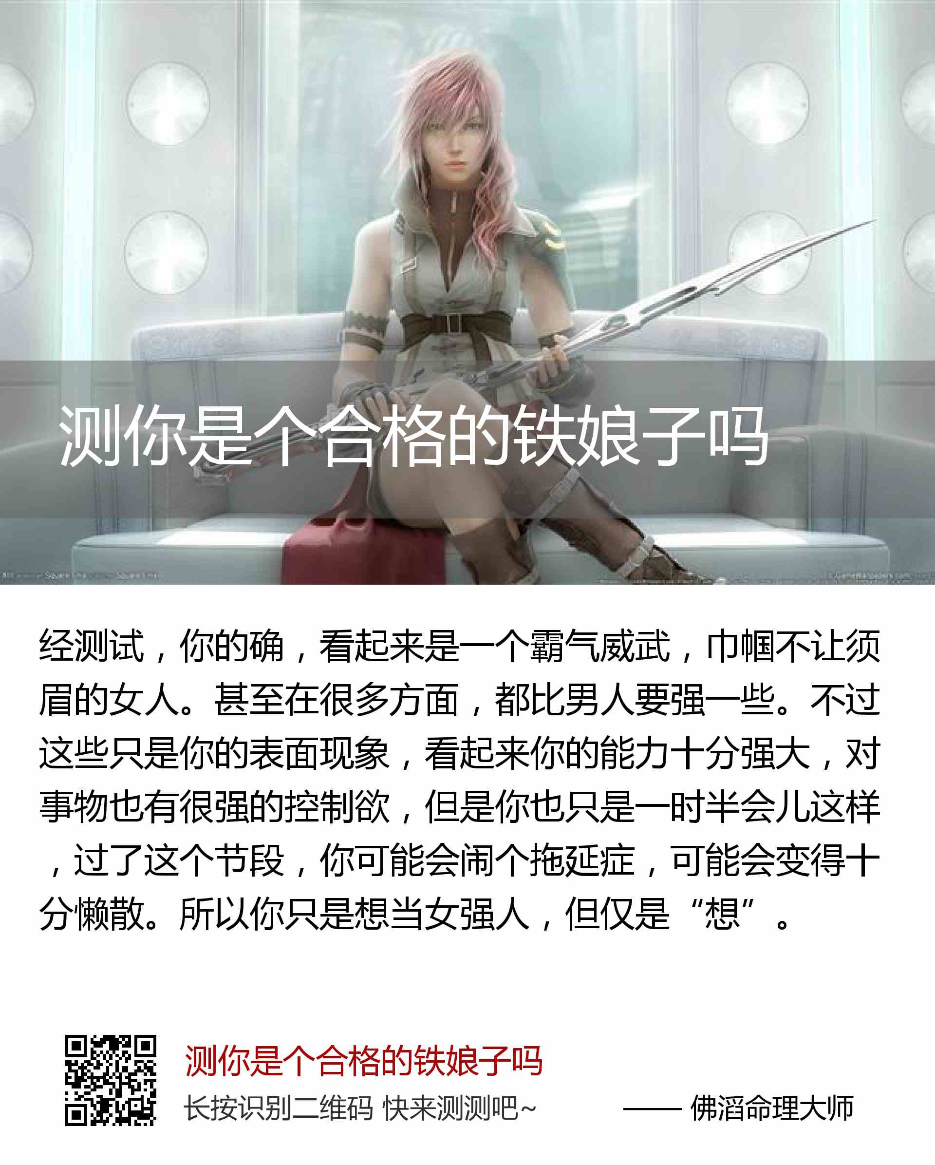 甚至在很多方面,都比男人要强一些。不过这些只是你的表面现象,看起来你的能力十分强大,对事物也有很强的控制欲,但是你也只是一时半会儿这样,过了这个节段,你可能会闹个拖延症,可能会变得十分懒散。所以你只是想当女强人,但仅是“想”。