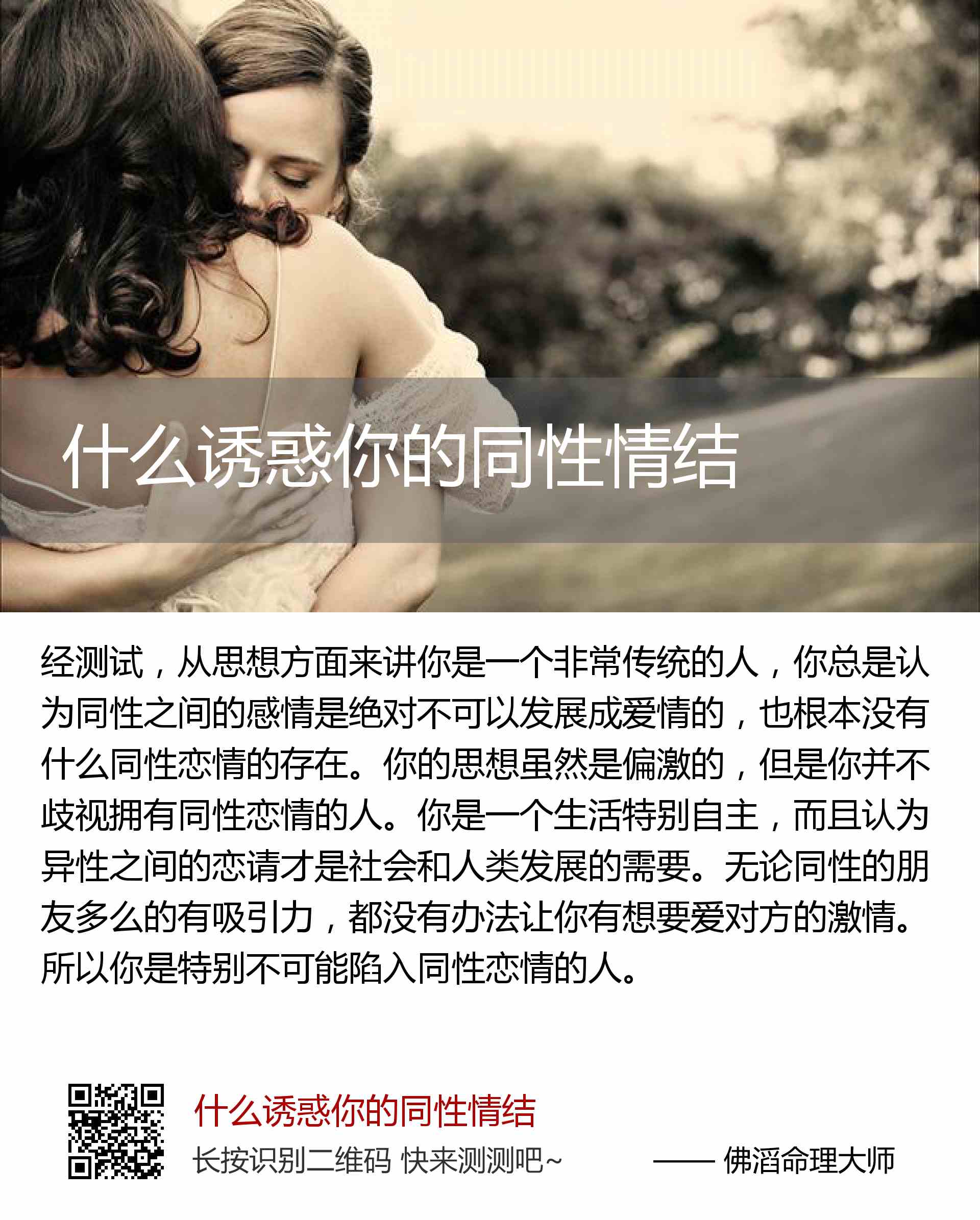 你的思想虽然是偏激的,但是你并不歧视拥有同性恋情的人。你是一个生活特别自主,而且认为异性之间的恋请才是社会和人类发展的需要。无论同性的朋友多么的有吸引力,都没有办法让你有想要爱对方的激情。所以你是特别不可能陷入同性恋情的人。