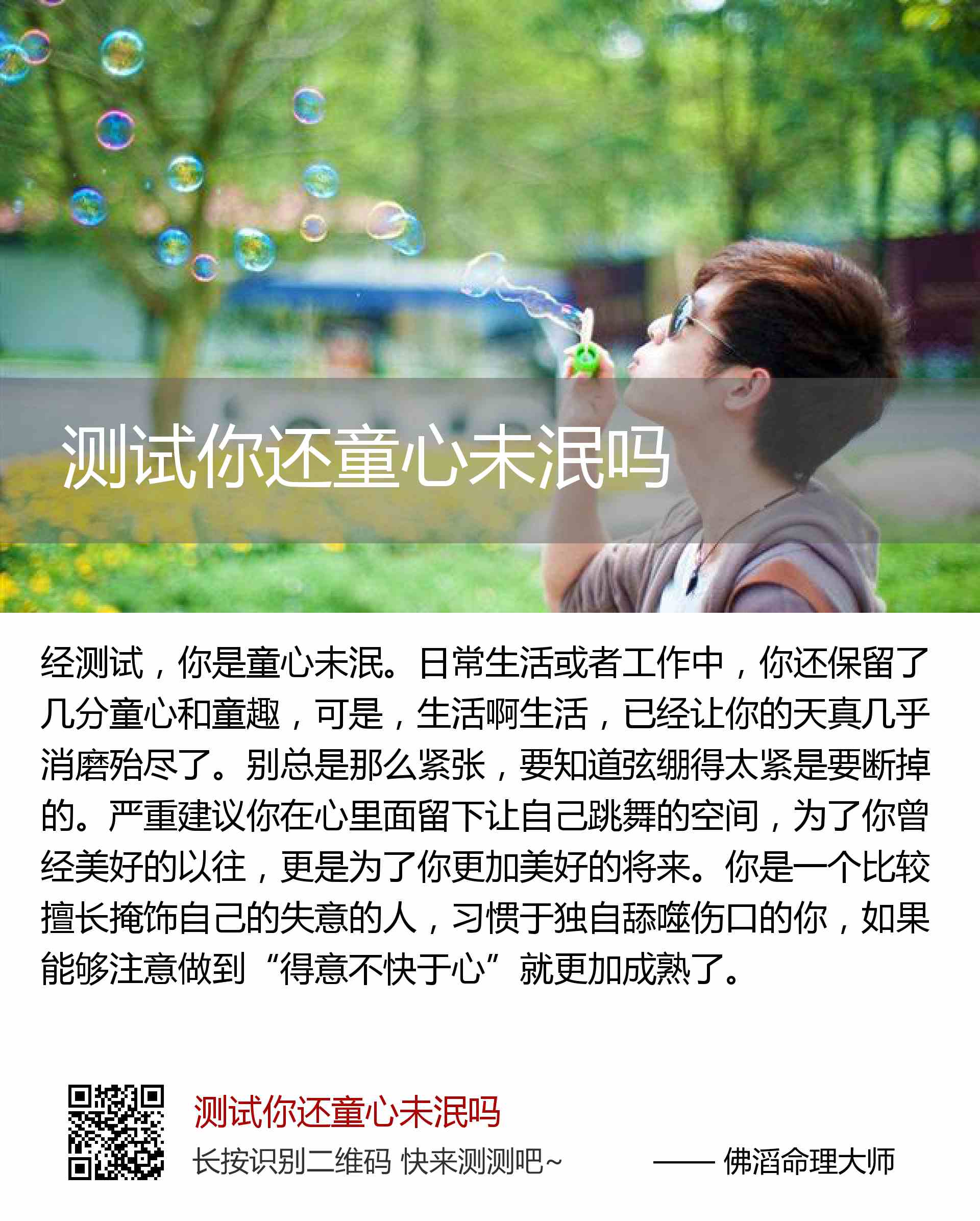 日常生活或者工作中,你还保留了几分童心和童趣,可是,生活啊生活,已经让你的天真几乎消磨殆尽了。别总是那么紧张,要知道弦绷得太紧是要断掉的。严重建议你在心里面留下让自己跳舞的空间,为了你曾经美好的以往,更是为了你更加美好的将来。你是一个比较擅长掩饰自己的失意的人,习惯于独自舔噬伤口的你,如果能够注意做到“得意不快于心”就更加成熟了。