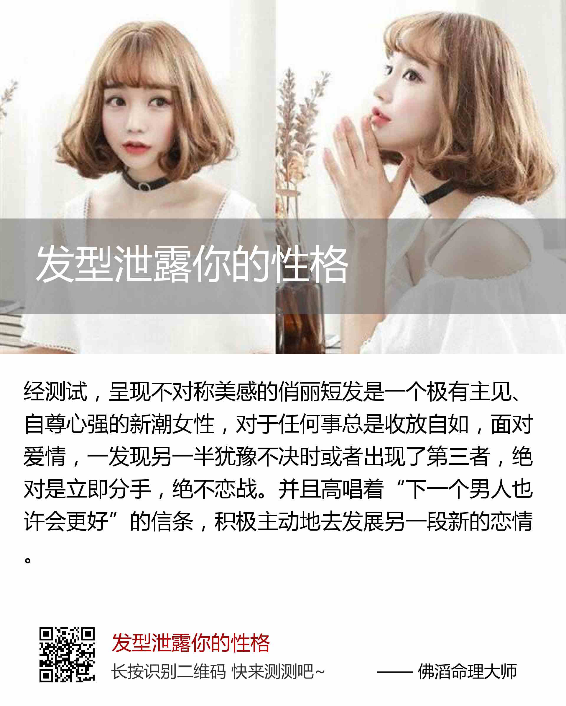 呈现不对称美感的俏丽短发是一个极有主见、自尊心强的新潮女性,对于任何事总是收放自如,面对爱情,一发现另一半犹豫不决时或者出现了第三者,绝对是立即分手,绝不恋战。