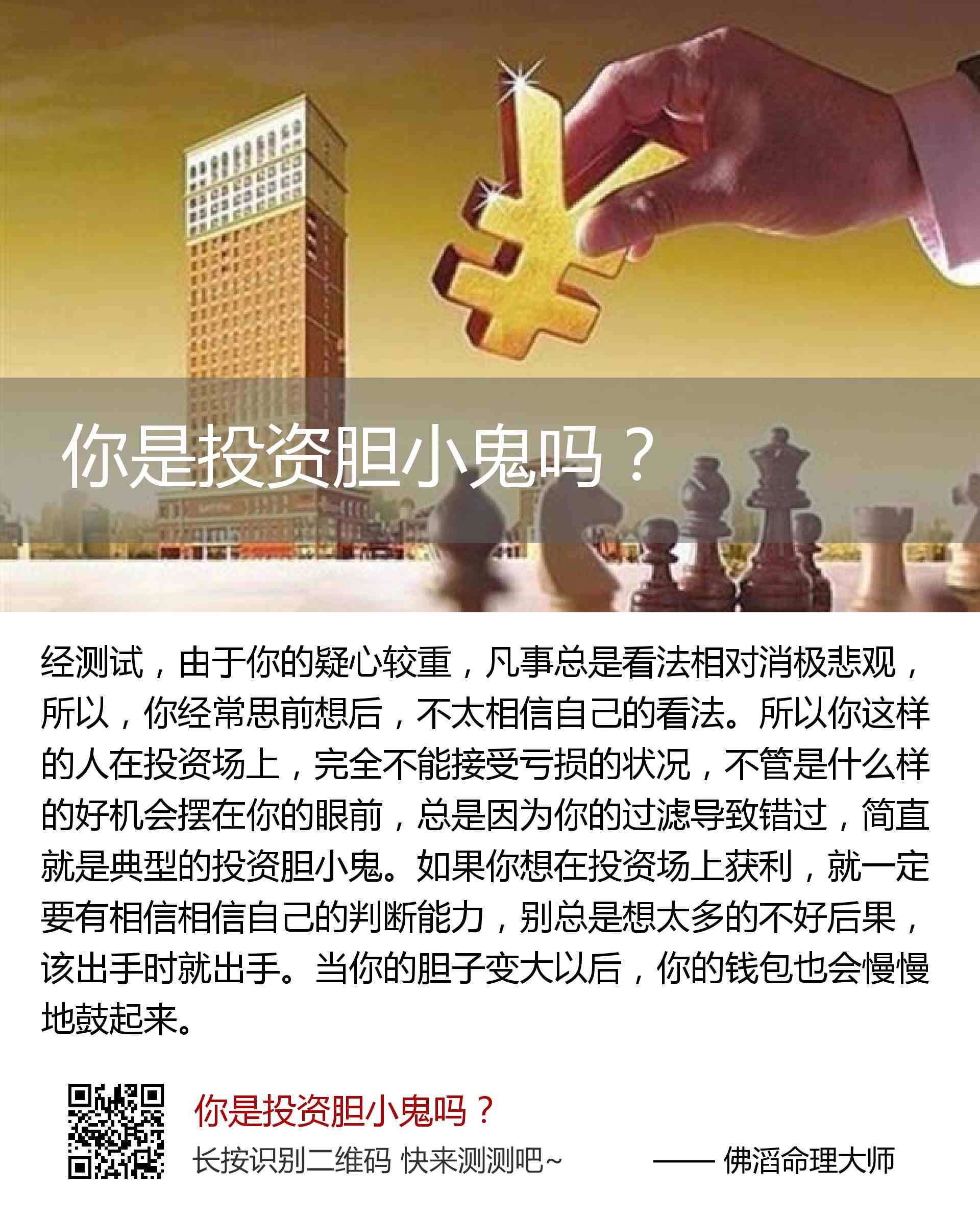 所以你这样的人在投资场上,完全不能接受亏损的状况,不管是什么样的好机会摆在你的眼前,总是因为你的过滤导致错过,简直就是典型的投资胆小鬼。如果你想在投资场上获利,就一定要有相信相信自己的判断能力,别总是想太多的不好后果,该出手时就出手。当你的胆子变大以后,你的钱包也会慢慢地鼓起来。