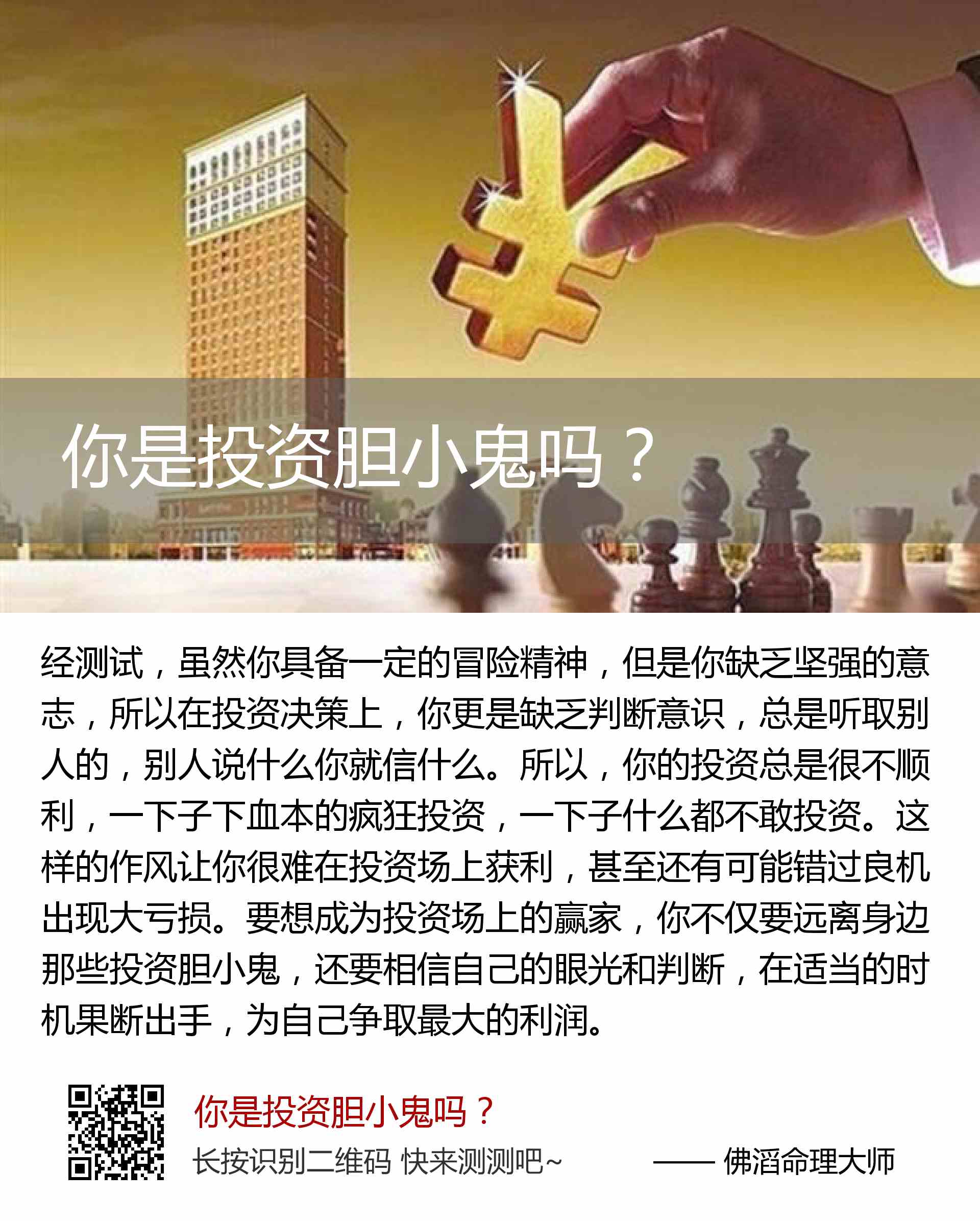 所以,你的投资总是很不顺利,一下子下血本的疯狂投资,一下子什么都不敢投资。这样的作风让你很难在投资场上获利,甚至还有可能错过良机出现大亏损。要想成为投资场上的赢家,你不仅要远离身边那些投资胆小鬼,还要相信自己的眼光和判断,在适当的时机果断出手,为自己争取最大的利润。