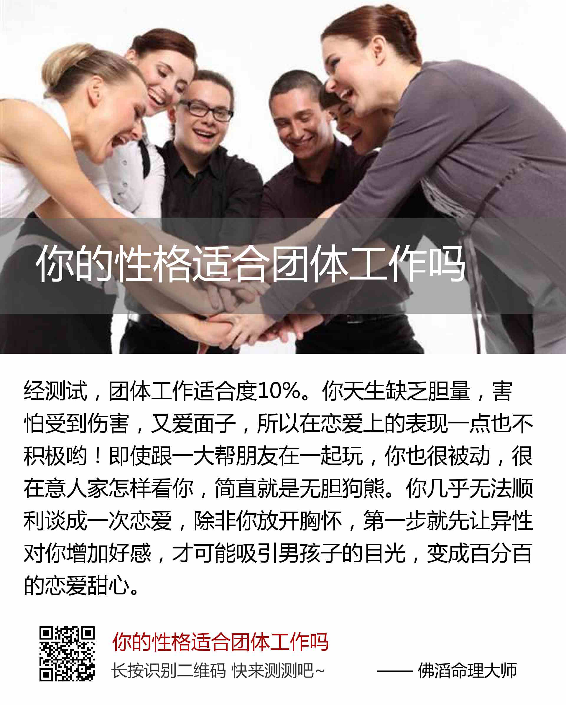 你天生缺乏胆量,害怕受到伤害,又爱面子,所以在恋爱上的表现一点也不积极哟!即使跟一大帮朋友在一起玩,你也很被动,很在意人家怎样看你,简直就是无胆狗熊。你几乎无法顺利谈成一次恋爱,除非你放开胸怀,第一步就先让异性对你增加好感,才可能吸引男孩子的目光,变成百分百的恋爱甜心。