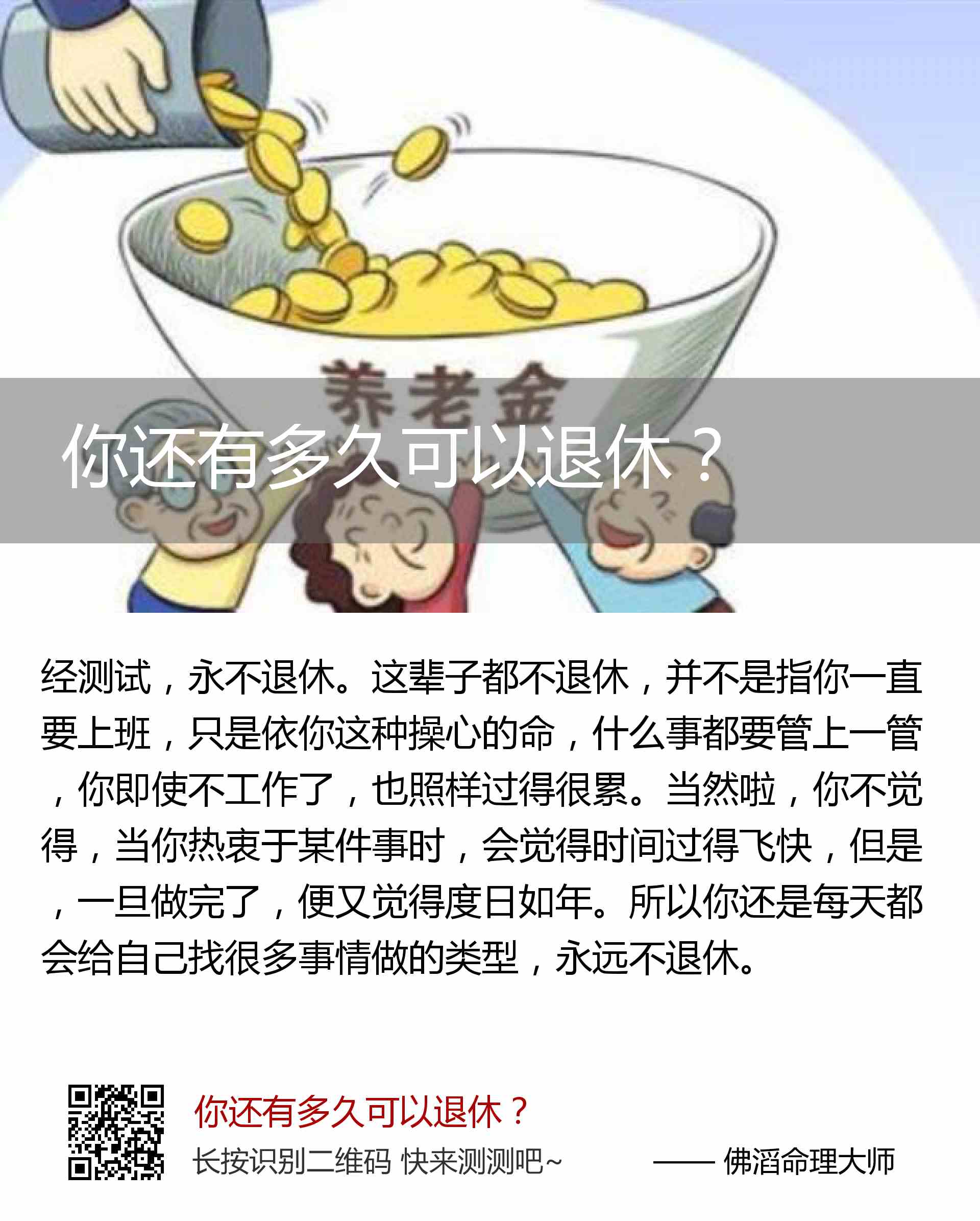 这辈子都不退休,并不是指你一直要上班,只是依你这种操心的命,什么事都要管上一管,你即使不工作了,也照样过得很累。当然啦,你不觉得,当你热衷于某件事时,会觉得时间过得飞快,但是,一旦做完了,便又觉得度日如年。所以你还是每天都会给自己找很多事情做的类型,永远不退休。