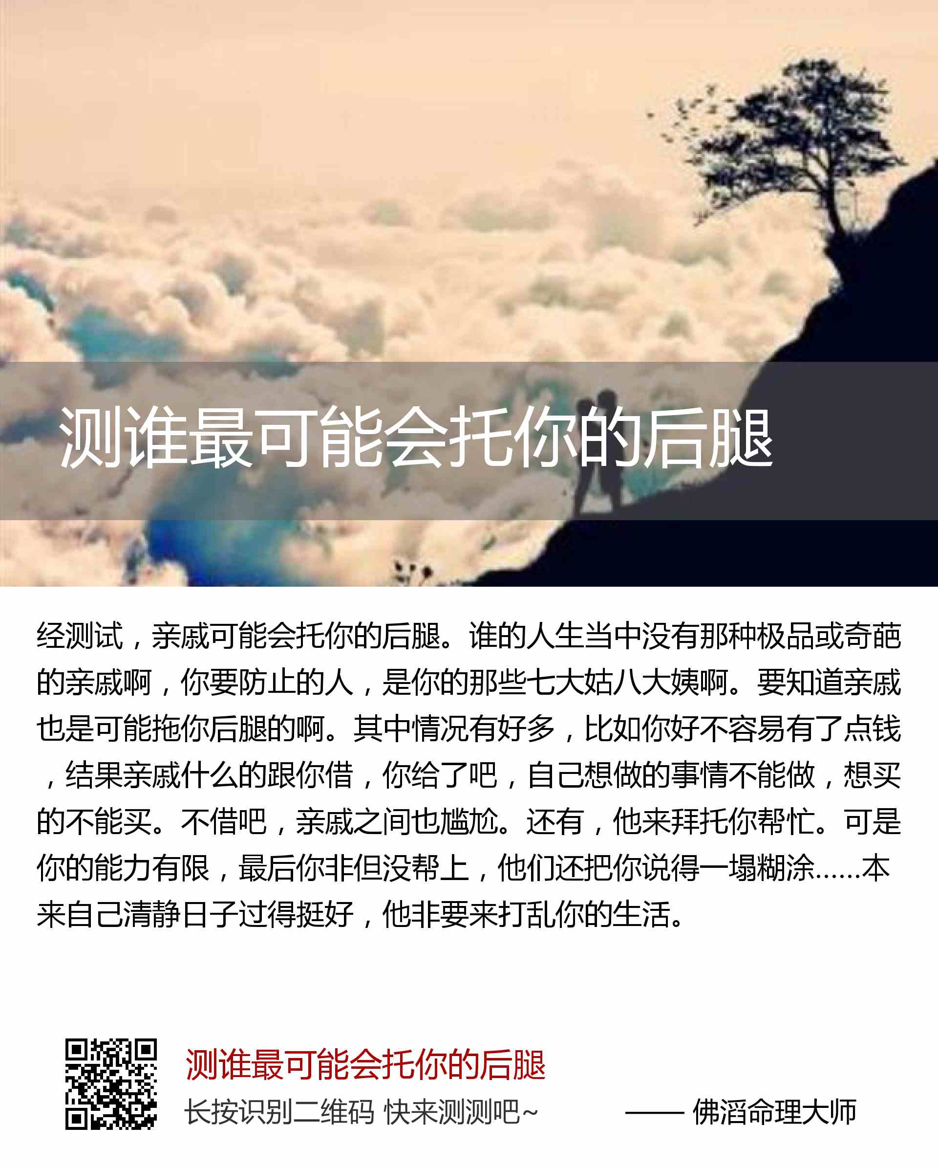 谁的人生当中没有那种极品或奇葩的亲戚啊,你要防止的人,是你的那些七大姑八大姨啊。要知道亲戚也是可能拖你后腿的啊。其中情况有好多,比如你好不容易有了点钱,结果亲戚什么的跟你借,你给了吧,自己想做的事情不能做,想买的不能买。不借吧,亲戚之间也尴尬。还有,他来拜托你帮忙。可是你的能力有限,最后你非但没帮上,他们还把你说得一塌糊涂……本来自己清静日子过得挺好,他非要来打乱你的生活。