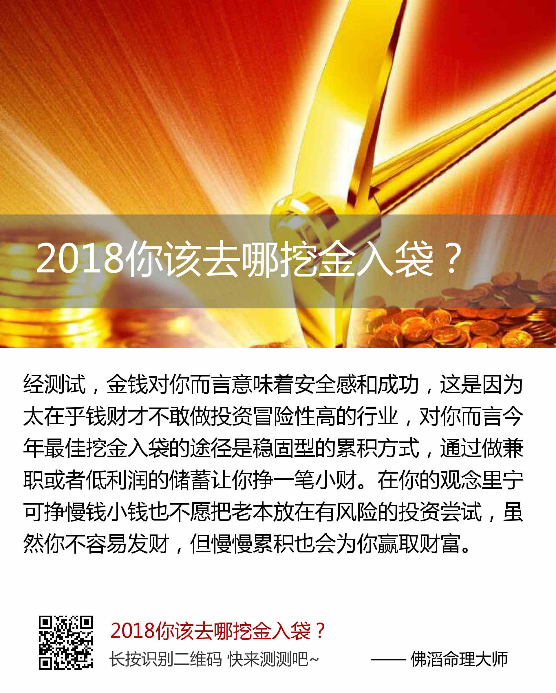 金钱对你而言意味着安全感和成功,这是因为太在乎钱财才不敢做投资冒险性高的行业,对你而言今年最佳挖金入袋的途径是稳固型的累积方式,通过做兼职或者低利润的储蓄让你挣一笔小财。