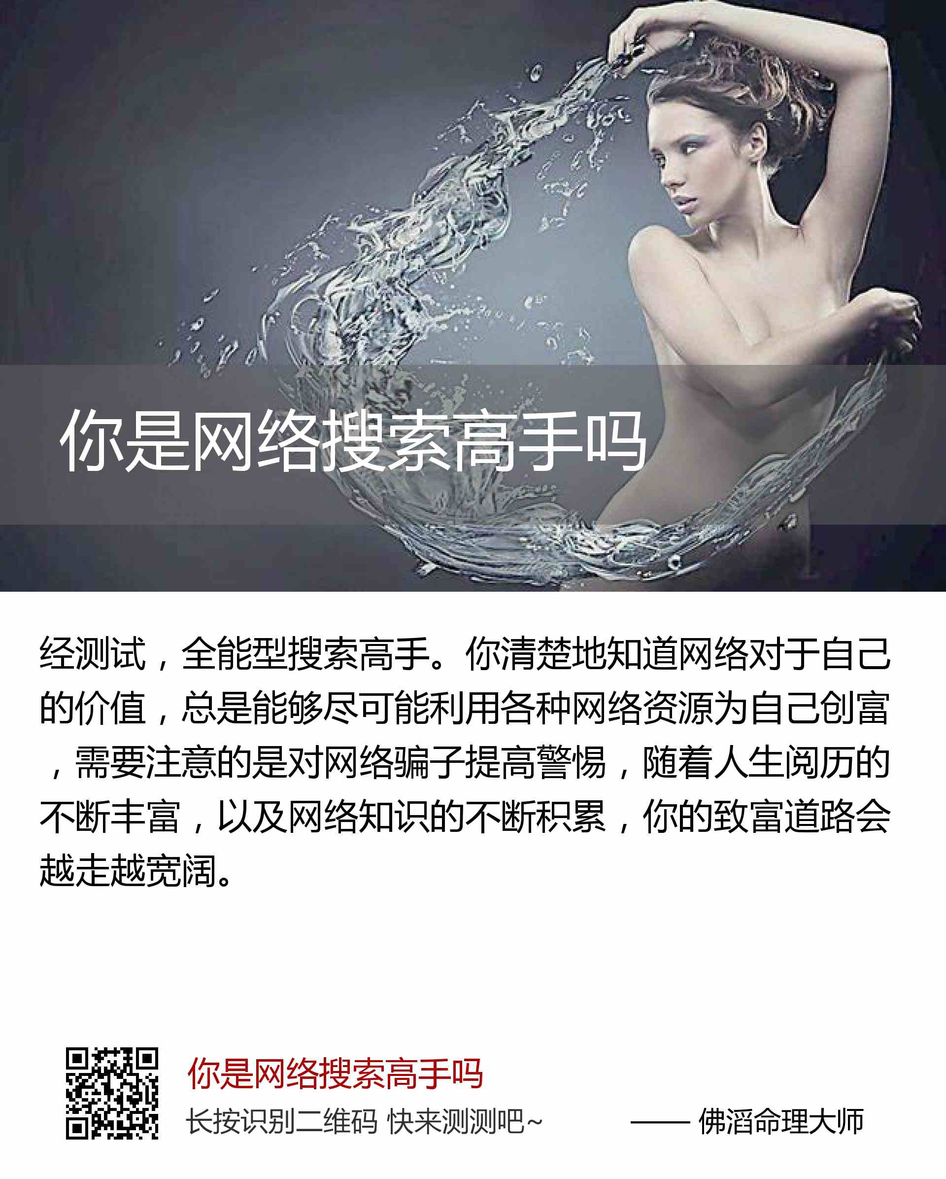 你清楚地知道网络对于自己的价值,总是能够尽可能利用各种网络资源为自己创富,需要注意的是对网络骗子提高警惕,随着人生阅历的不断丰富,以及网络知识的不断积累,你的致富道路会越走越宽阔。
