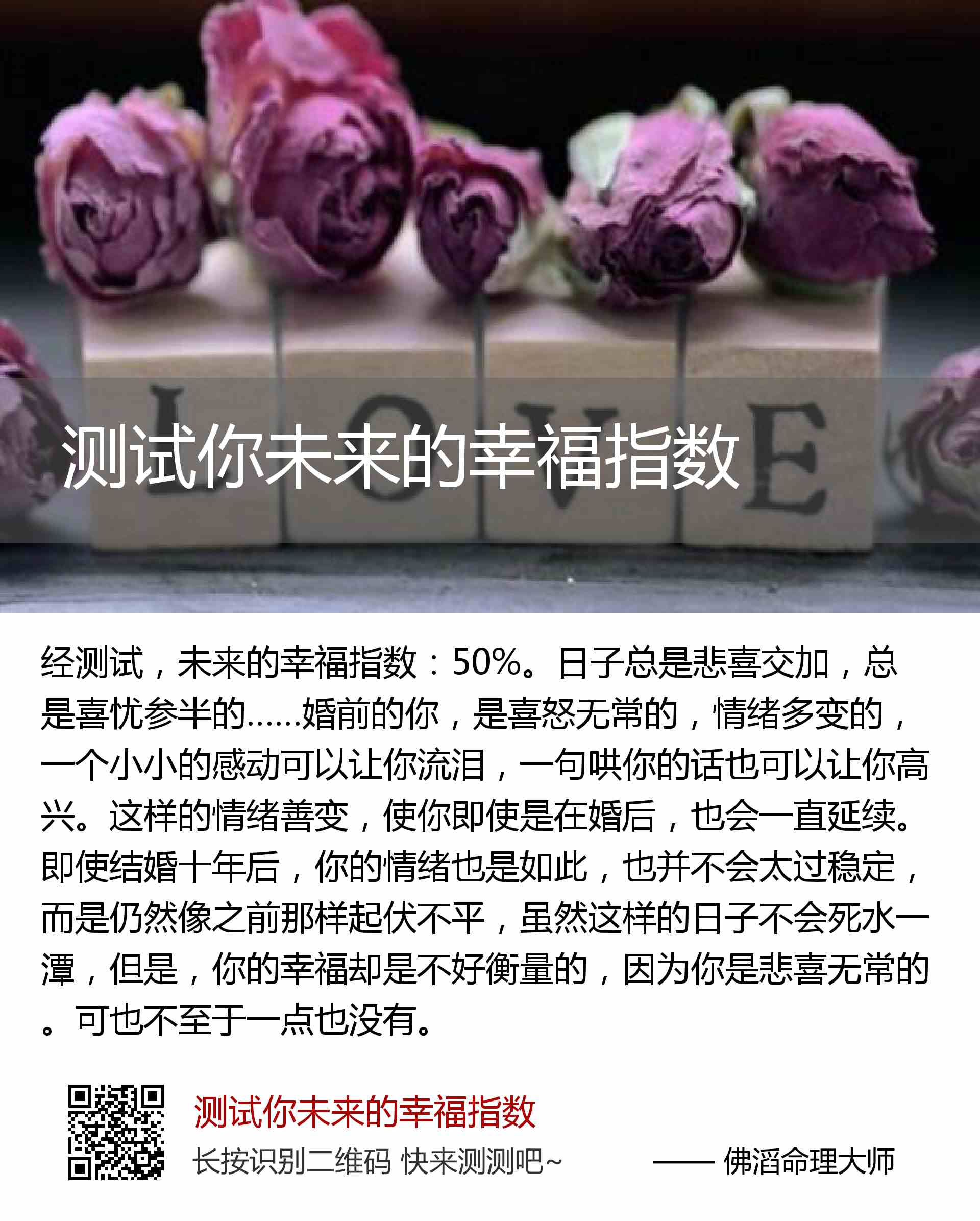 日子总是悲喜交加,总是喜忧参半的……婚前的你,是喜怒无常的,情绪多变的,一个小小的感动可以让你流泪,一句哄你的话也可以让你高兴。这样的情绪善变,使你即使是在婚后,也会一直延续。即使结婚十年后,你的情绪也是如此,也并不会太过稳定,而是仍然像之前那样起伏不平,虽然这样的日子不会死水一潭,但是,你的幸福却是不好衡量的,因为你是悲喜无常的。可也不至于一点也没有。