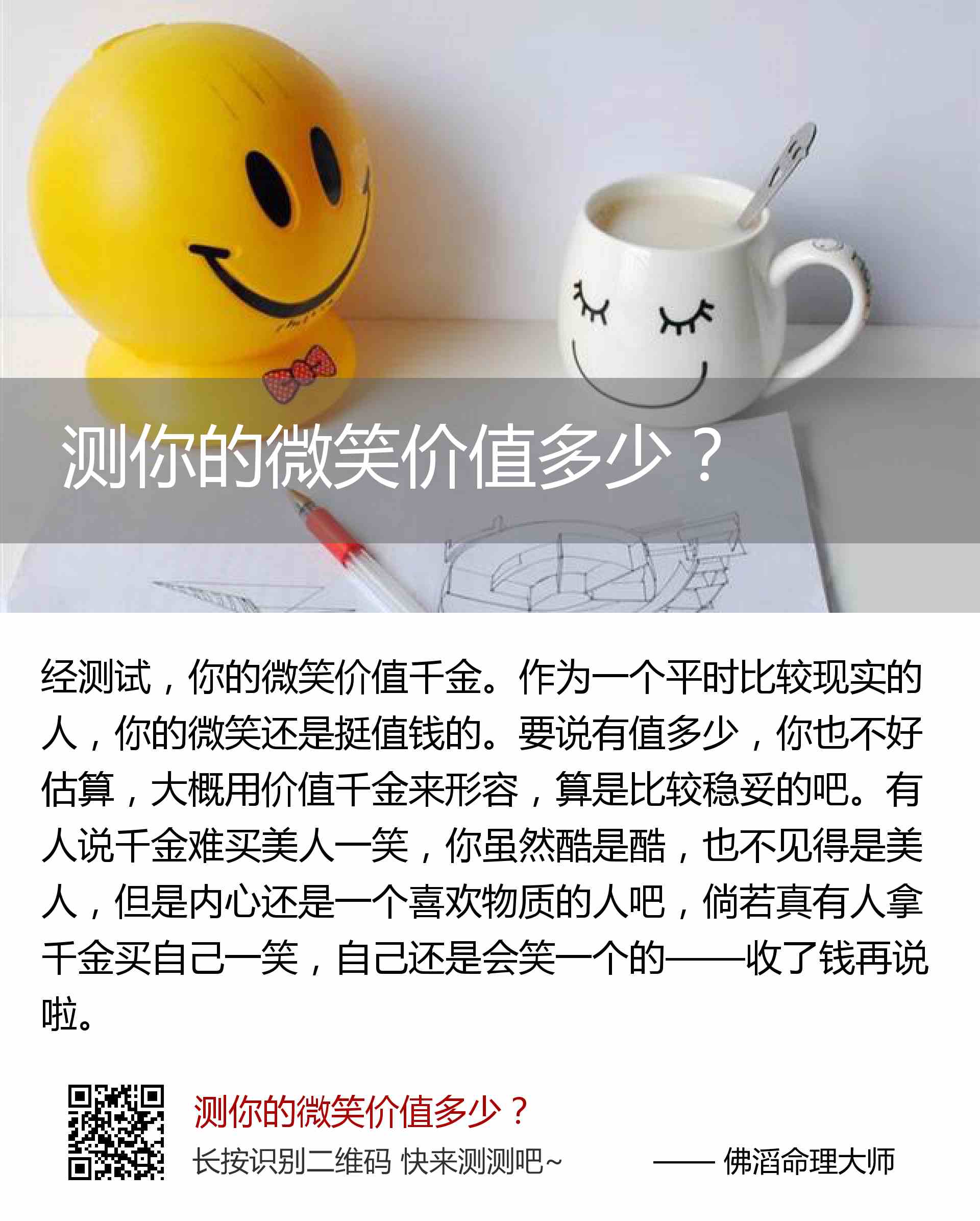 作为一个平时比较现实的人,你的微笑还是挺值钱的。要说有值多少,你也不好估算,大概用价值千金来形容,算是比较稳妥的吧。有人说千金难买美人一笑,你虽然酷是酷,也不见得是美人,但是内心还是一个喜欢物质的人吧,倘若真有人拿千金买自己一笑,自己还是会笑一个的——收了钱再说啦。