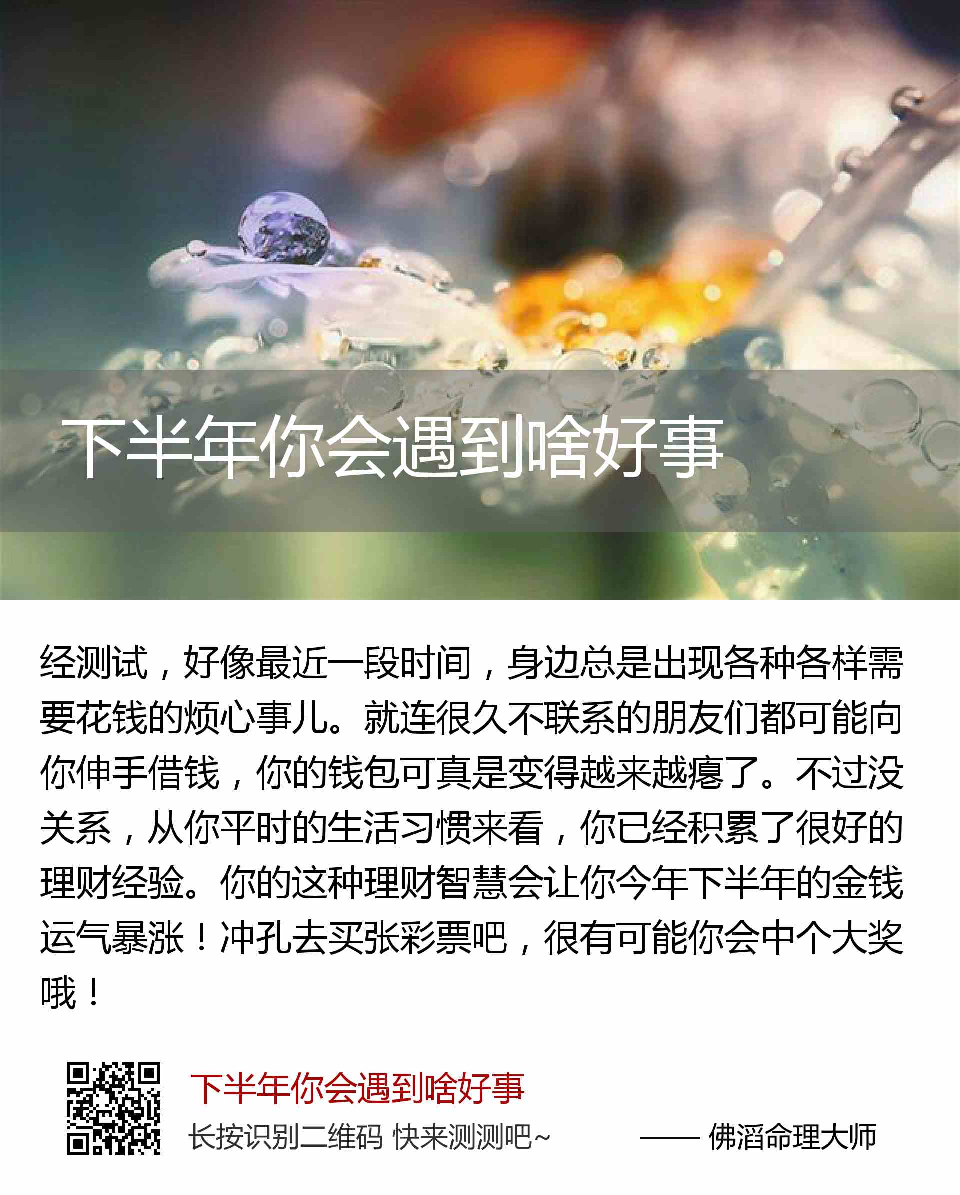 就连很久不联系的朋友们都可能向你伸手借钱,你的钱包可真是变得越来越瘪了。不过没关系,从你平时的生活习惯来看,你已经积累了很好的理财经验。你的这种理财智慧会让你今年下半年的金钱运气暴涨!冲孔去买张彩票吧,很有可能你会中个大奖哦!