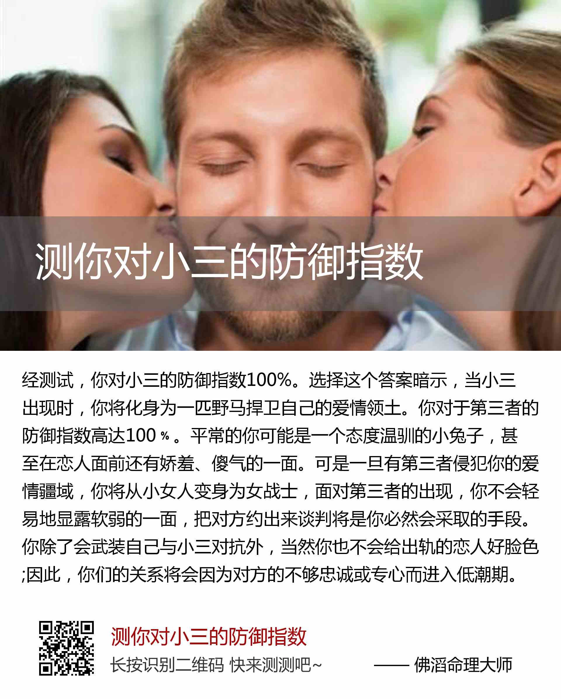 选择这个答案暗示,当小三出现时,你将化身为一匹野马捍卫自己的爱情领土。你对于第三者的防御指数高达100﹪。平常的你可能是一个态度温驯的小兔子,甚至在恋人面前还有娇羞、傻气的一面。可是一旦有第三者侵犯你的爱情疆域,你将从小女人变身为女战士,面对第三者的出现,你不会轻易地显露软弱的一面,把对方约出来谈判将是你必然会采取的手段。你除了会武装自己与小三对抗外,当然你也不会给出轨的恋人好脸色;因此,你们的关系将会因为对方的不够忠诚或专心而进入低潮期。