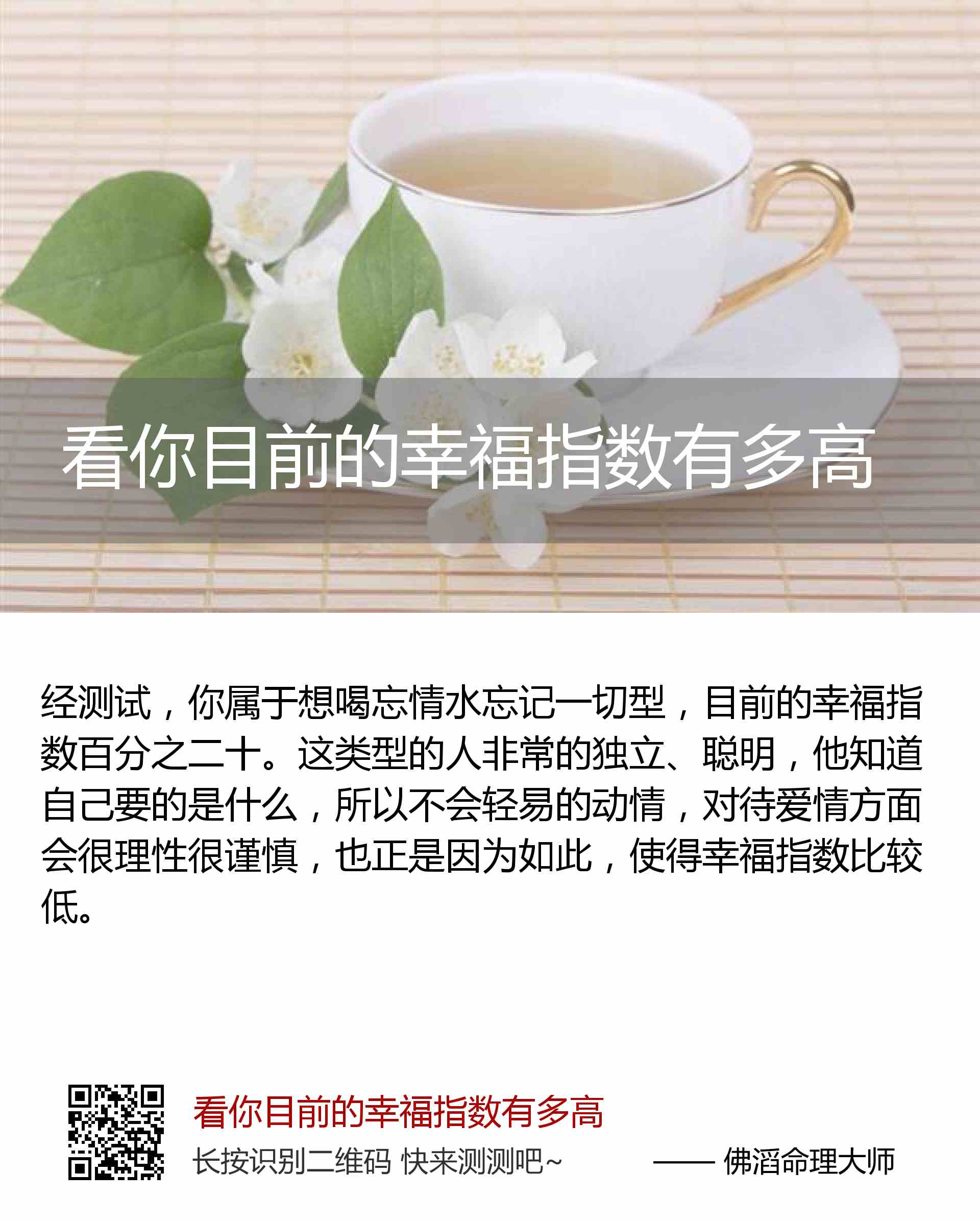 你属于想喝忘情水忘记一切型,目前的幸福指数百分之二十。