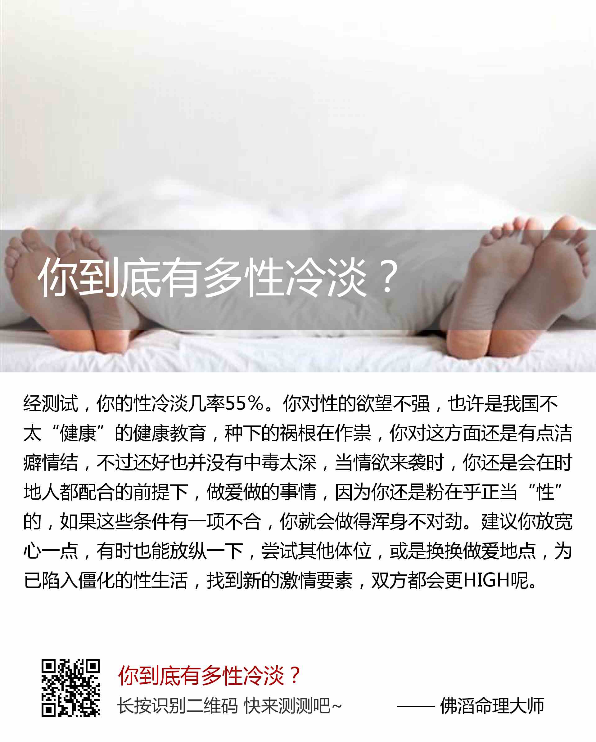 你对性的欲望不强,也许是我国不太“健康”的健康教育,种下的祸根在作祟,你对这方面还是有点洁癖情结,不过还好也并没有中毒太深,当情欲来袭时,你还是会在时地人都配合的前提下,做爱做的事情,因为你还是粉在乎正当“性”的,如果这些条件有一项不合,你就会做得浑身不对劲。建议你放宽心一点,有时也能放纵一下,尝试其他体位,或是换换做爱地点,为已陷入僵化的性生活,找到新的激情要素,双方都会更HIGH呢。