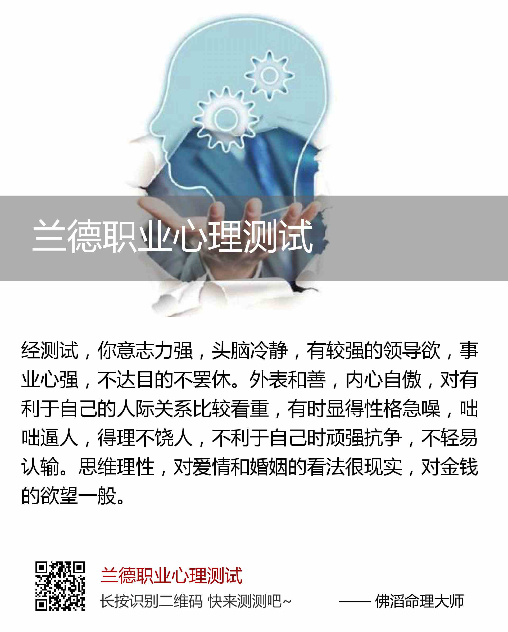 你意志力强,头脑冷静,有较强的领导欲,事业心强,不达目的不罢休。
