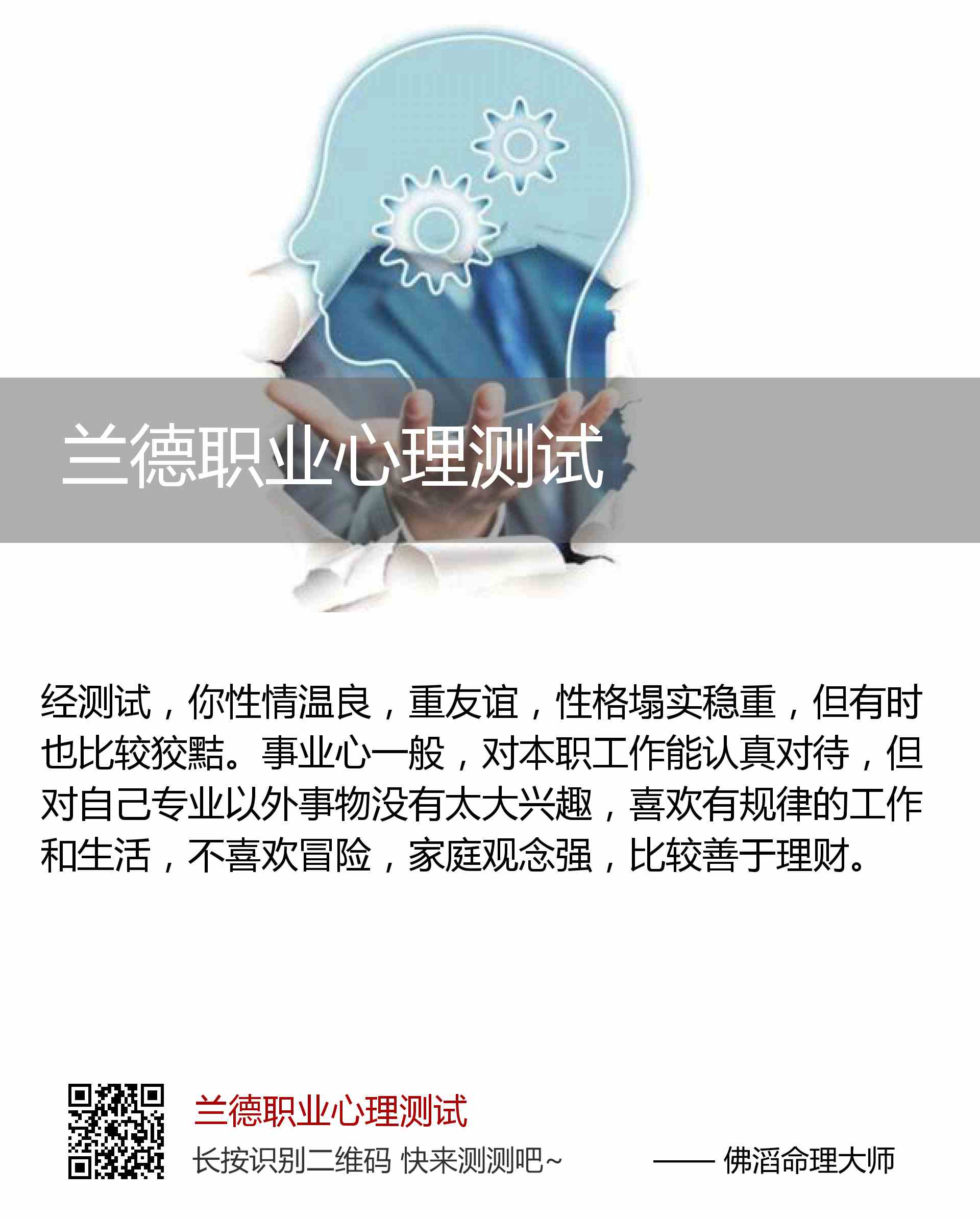 事业心一般,对本职工作能认真对待,但对自己专业以外事物没有太大兴趣,喜欢有规律的工作和生活,不喜欢冒险,家庭观念强,比较善于理财。