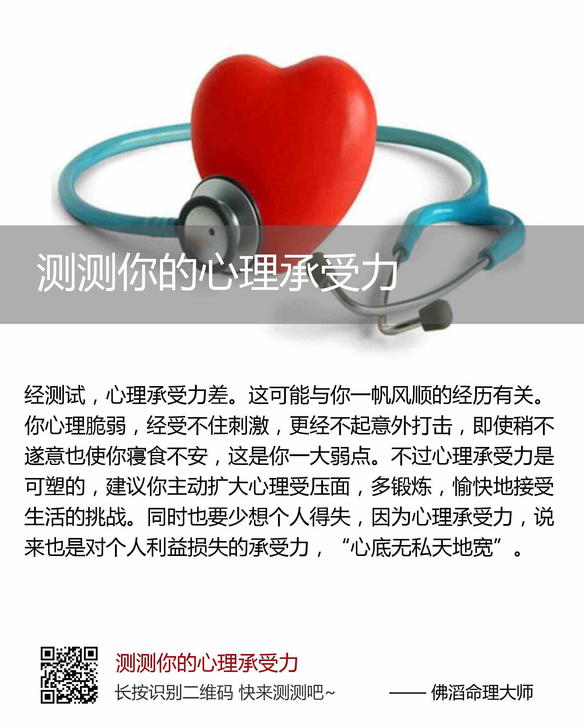 这可能与你一帆风顺的经历有关。你心理脆弱,经受不住刺激,更经不起意外打击,即使稍不遂意也使你寝食不安,这是你一大弱点。不过心理承受力是可塑的,建议你主动扩大心理受压面,多锻炼,愉快地接受生活的挑战。同时也要少想个人得失,因为心理承受力,说来也是对个人利益损失的承受力,“心底无私天地宽”。