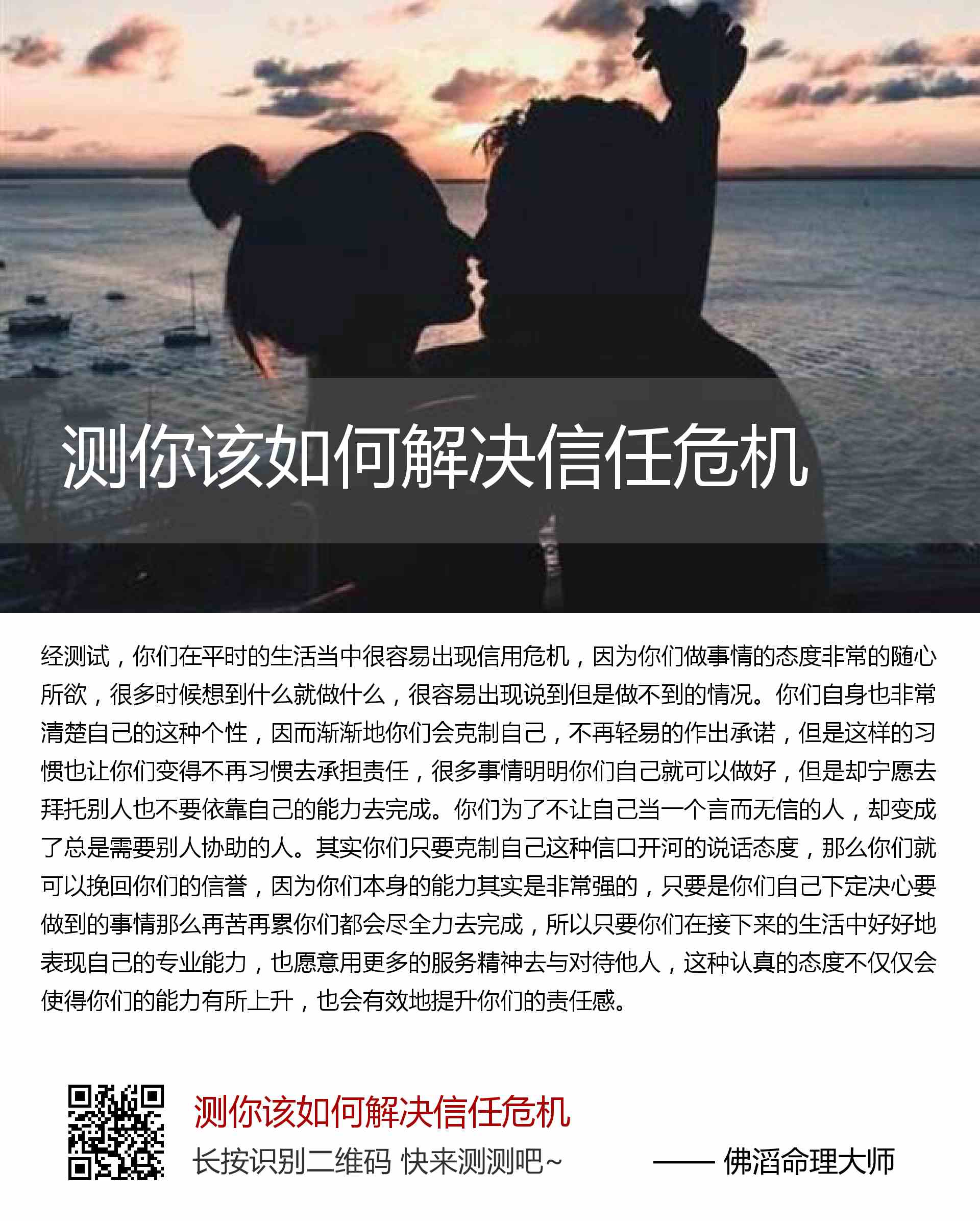 你们在平时的生活当中很容易出现信用危机,因为你们做事情的态度非常的随心所欲,很多时候想到什么就做什么,很容易出现说到但是做不到的情况。