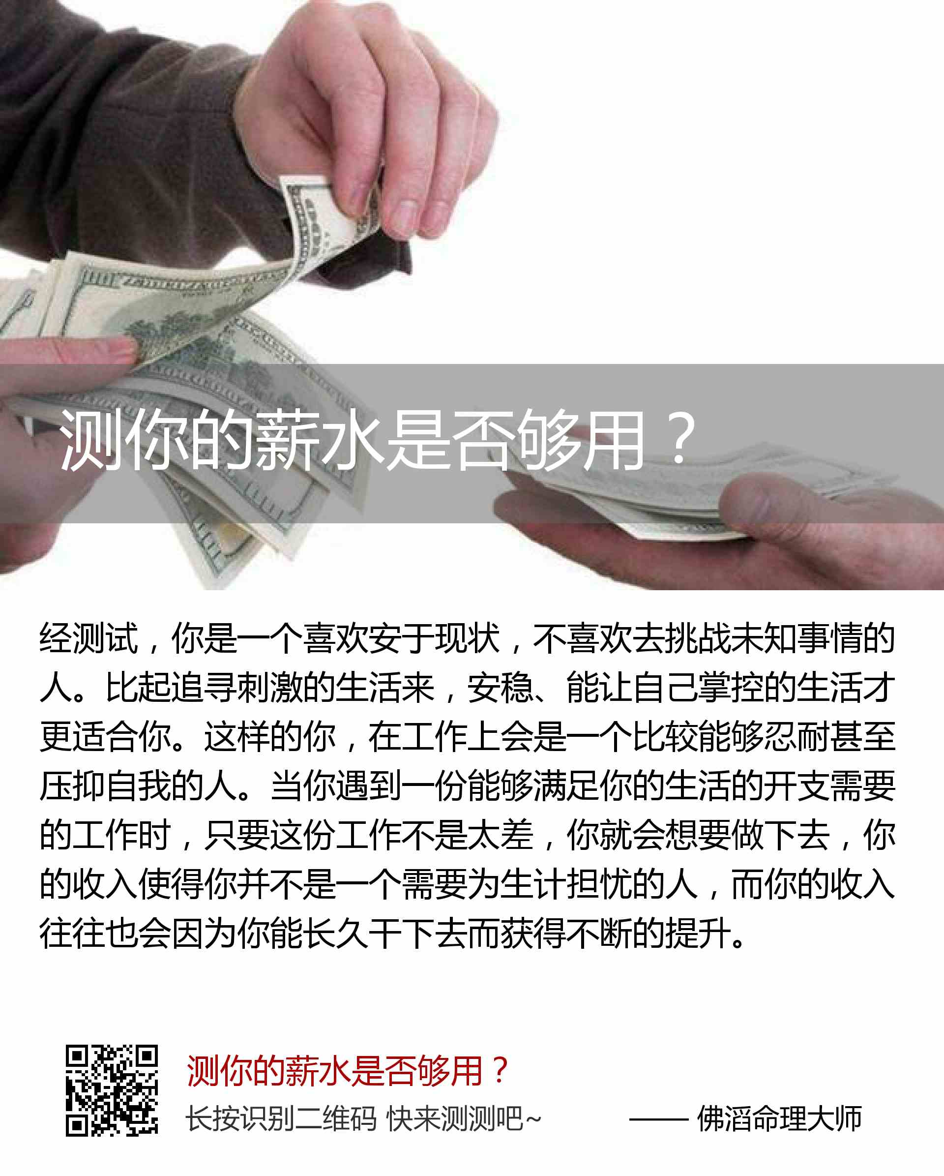 比起追寻刺激的生活来,安稳、能让自己掌控的生活才更适合你。这样的你,在工作上会是一个比较能够忍耐甚至压抑自我的人。当你遇到一份能够满足你的生活的开支需要的工作时,只要这份工作不是太差,你就会想要做下去,你的收入使得你并不是一个需要为生计担忧的人,而你的收入往往也会因为你能长久干下去而获得不断的提升。