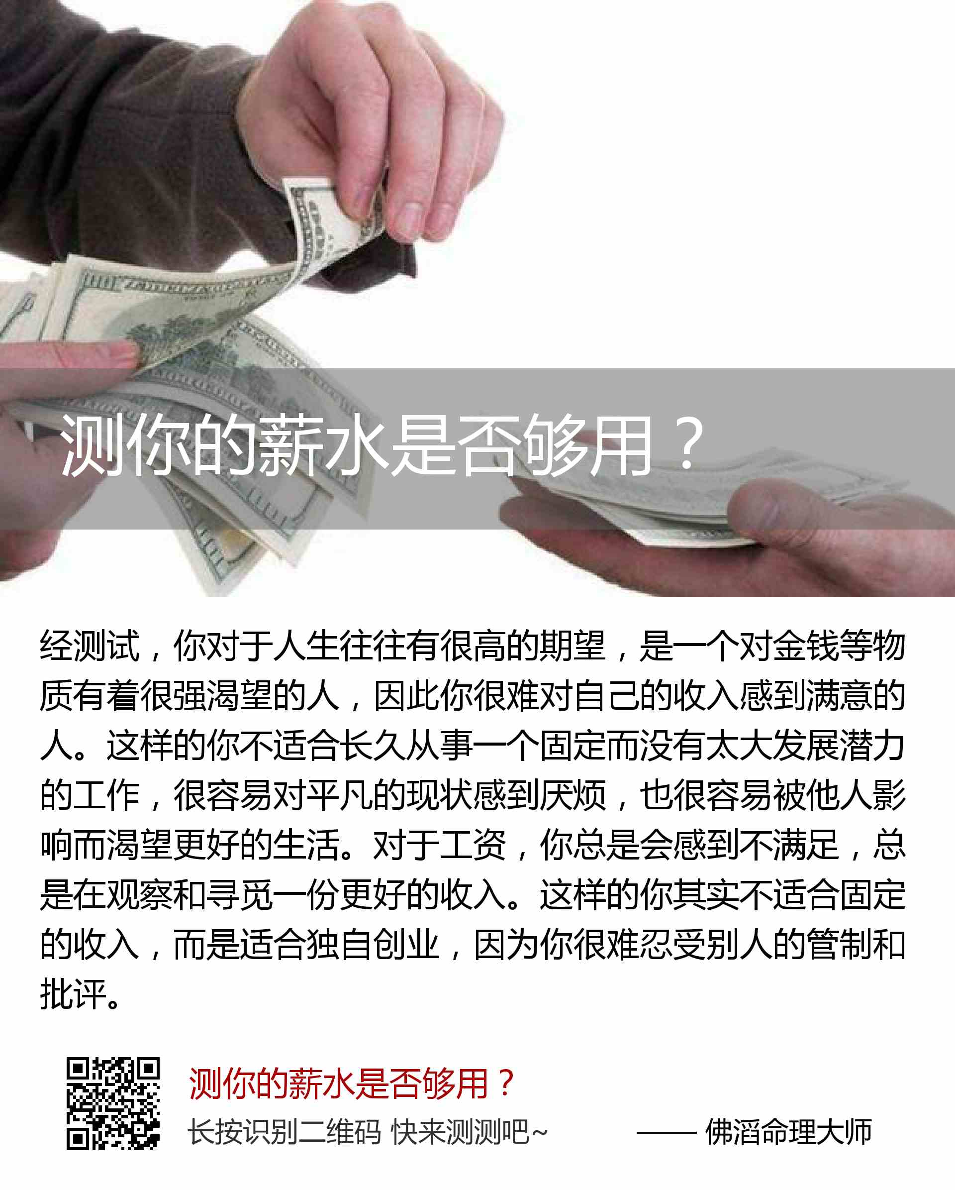 你对于人生往往有很高的期望,是一个对金钱等物质有着很强渴望的人,因此你很难对自己的收入感到满意的人。