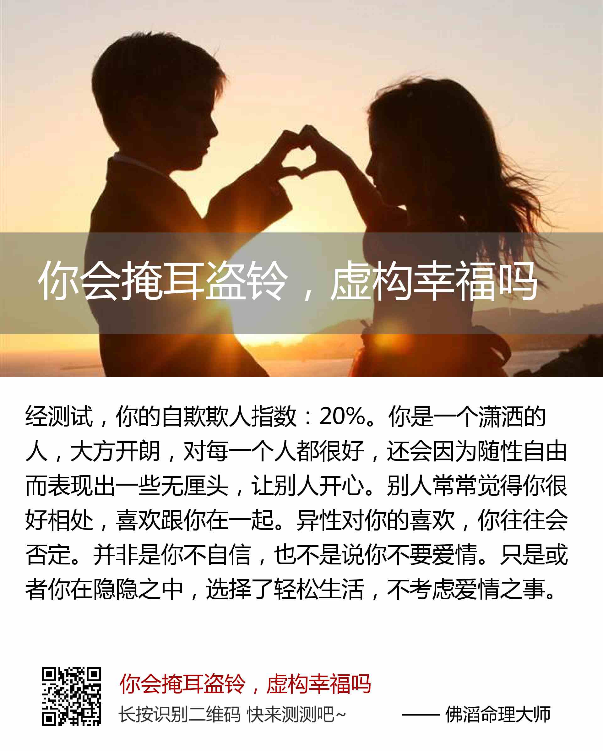你是一个潇洒的人,大方开朗,对每一个人都很好,还会因为随性自由而表现出一些无厘头,让别人开心。别人常常觉得你很好相处,喜欢跟你在一起。异性对你的喜欢,你往往会否定。并非是你不自信,也不是说你不要爱情。只是或者你在隐隐之中,选择了轻松生活,不考虑爱情之事。