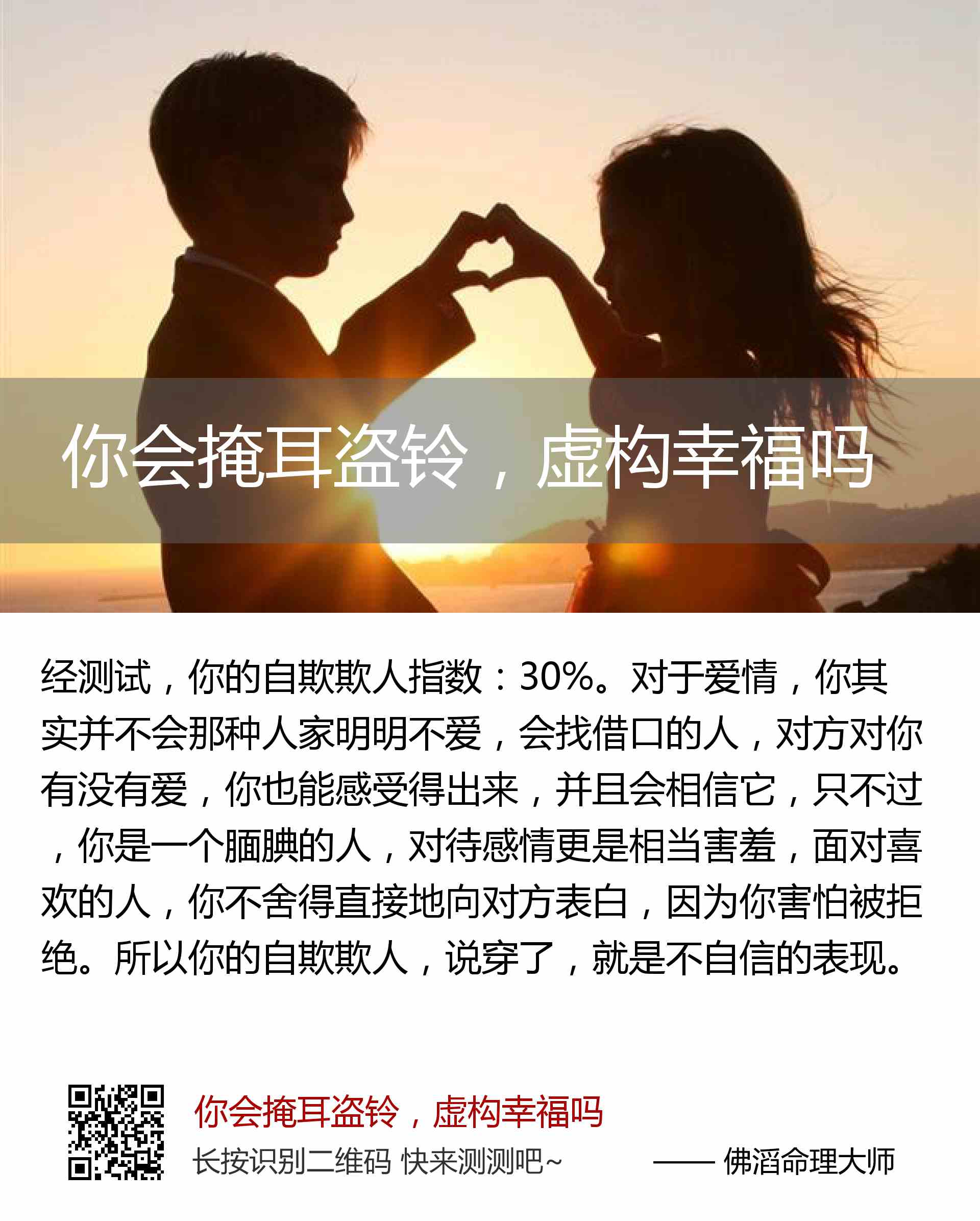 对于爱情,你其实并不会那种人家明明不爱,会找借口的人,对方对你有没有爱,你也能感受得出来,并且会相信它,只不过,你是一个腼腆的人,对待感情更是相当害羞,面对喜欢的人,你不舍得直接地向对方表白,因为你害怕被拒绝。所以你的自欺欺人,说穿了,就是不自信的表现。