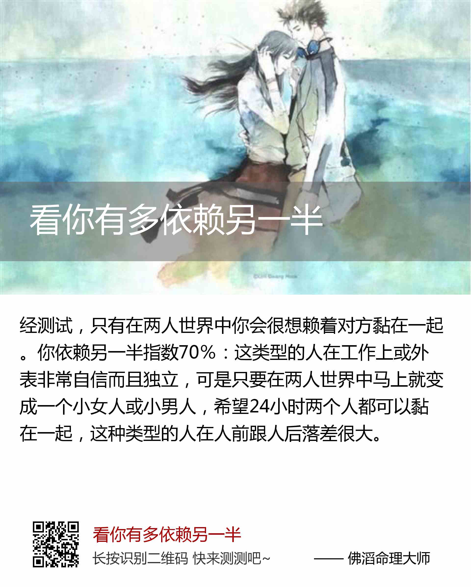 你依赖另一半指数70%:这类型的人在工作上或外表非常自信而且独立,可是只要在两人世界中马上就变成一个小女人或小男人,希望24小时两个人都可以黏在一起,这种类型的人在人前跟人后落差很大。