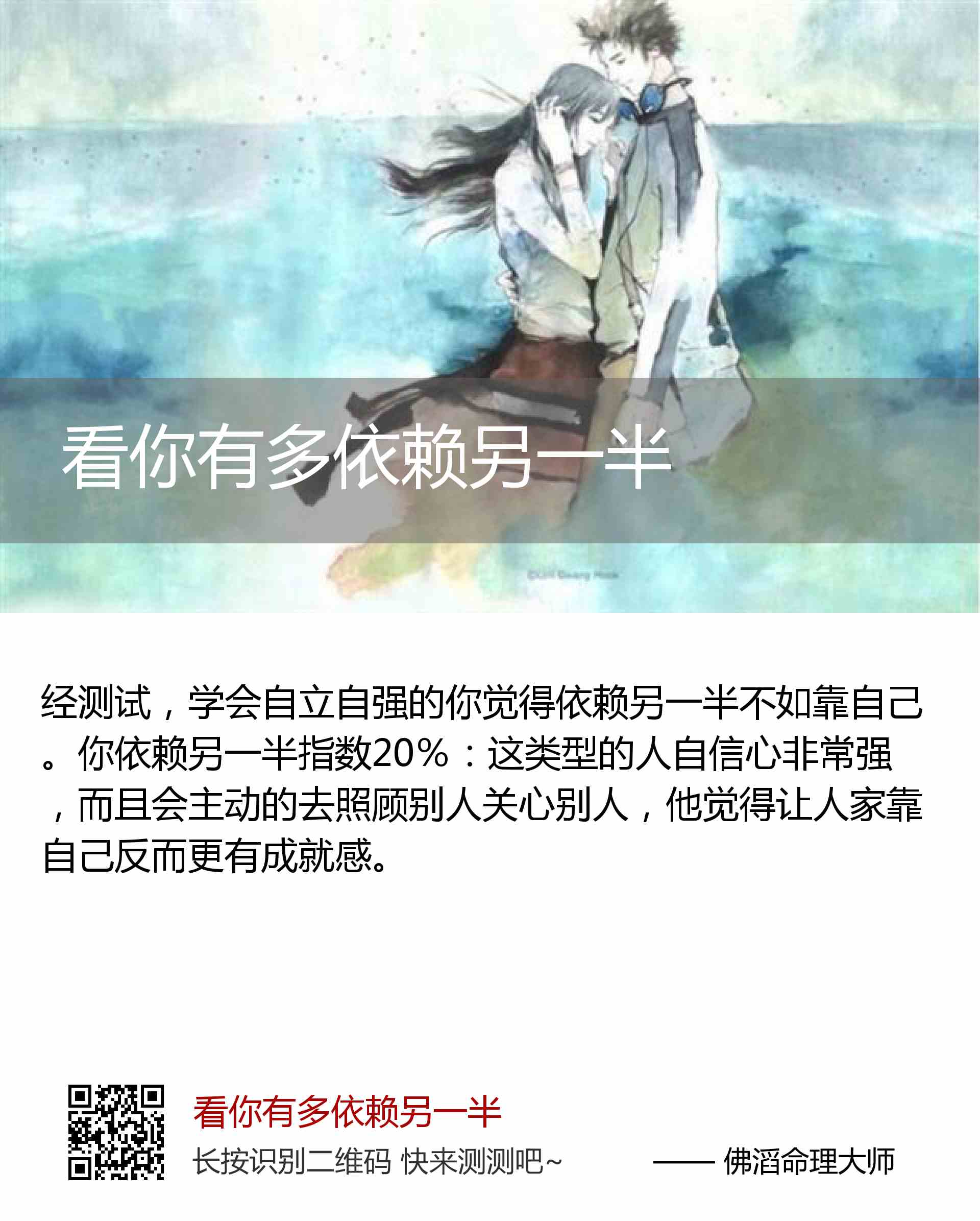 你依赖另一半指数20%:这类型的人自信心非常强,而且会主动的去照顾别人关心别人,他觉得让人家靠自己反而更有成就感。