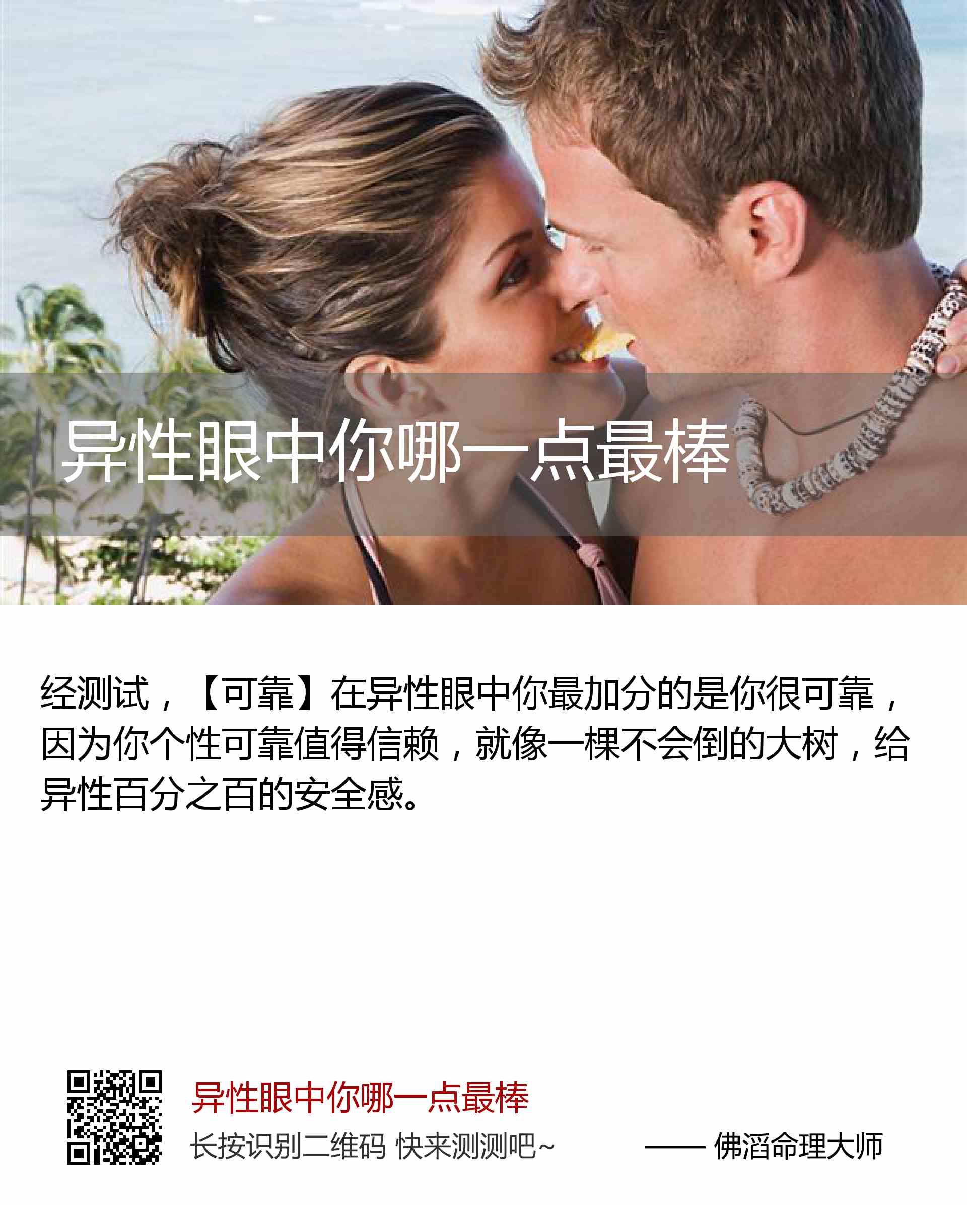【可靠】在异性眼中你最加分的是你很可靠,因为你个性可靠值得信赖,就像一棵不会倒的大树,给异性百分之百的安全感。