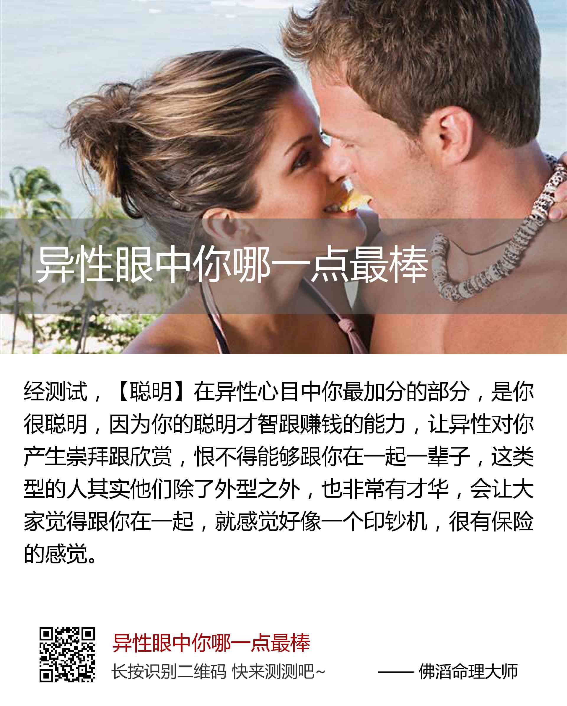 【聪明】在异性心目中你最加分的部分,是你很聪明,因为你的聪明才智跟赚钱的能力,让异性对你产生崇拜跟欣赏,恨不得能够跟你在一起一辈子,这类型的人其实他们除了外型之外,也非常有才华,会让大家觉得跟你在一起,就感觉好像一个印钞机,很有保险的感觉。