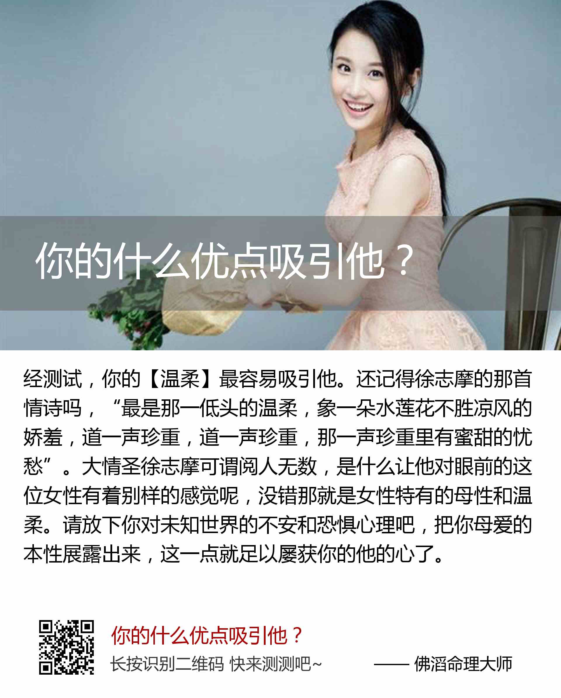 还记得徐志摩的那首情诗吗,“最是那一低头的温柔,象一朵水莲花不胜凉风的娇羞,道一声珍重,道一声珍重,那一声珍重里有蜜甜的忧愁”。大情圣徐志摩可谓阅人无数,是什么让他对眼前的这位女性有着别样的感觉呢,没错那就是女性特有的母性和温柔。请放下你对未知世界的不安和恐惧心理吧,把你母爱的本性展露出来,这一点就足以屡获你的他的心了。