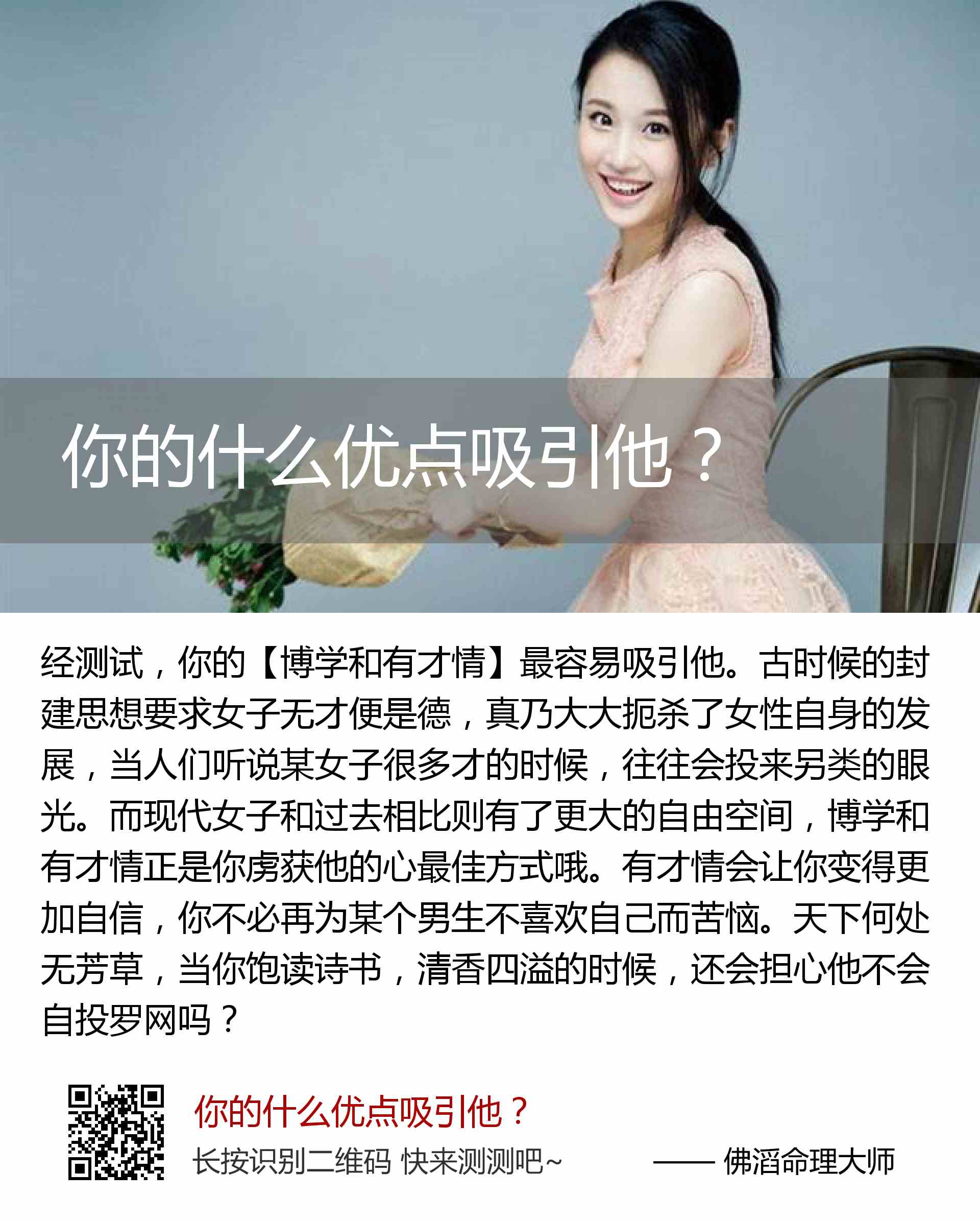 古时候的封建思想要求女子无才便是德,真乃大大扼杀了女性自身的发展,当人们听说某女子很多才的时候,往往会投来另类的眼光。而现代女子和过去相比则有了更大的自由空间,博学和有才情正是你虏获他的心最佳方式哦。有才情会让你变得更加自信,你不必再为某个男生不喜欢自己而苦恼。天下何处无芳草,当你饱读诗书,清香四溢的时候,还会担心他不会自投罗网吗?