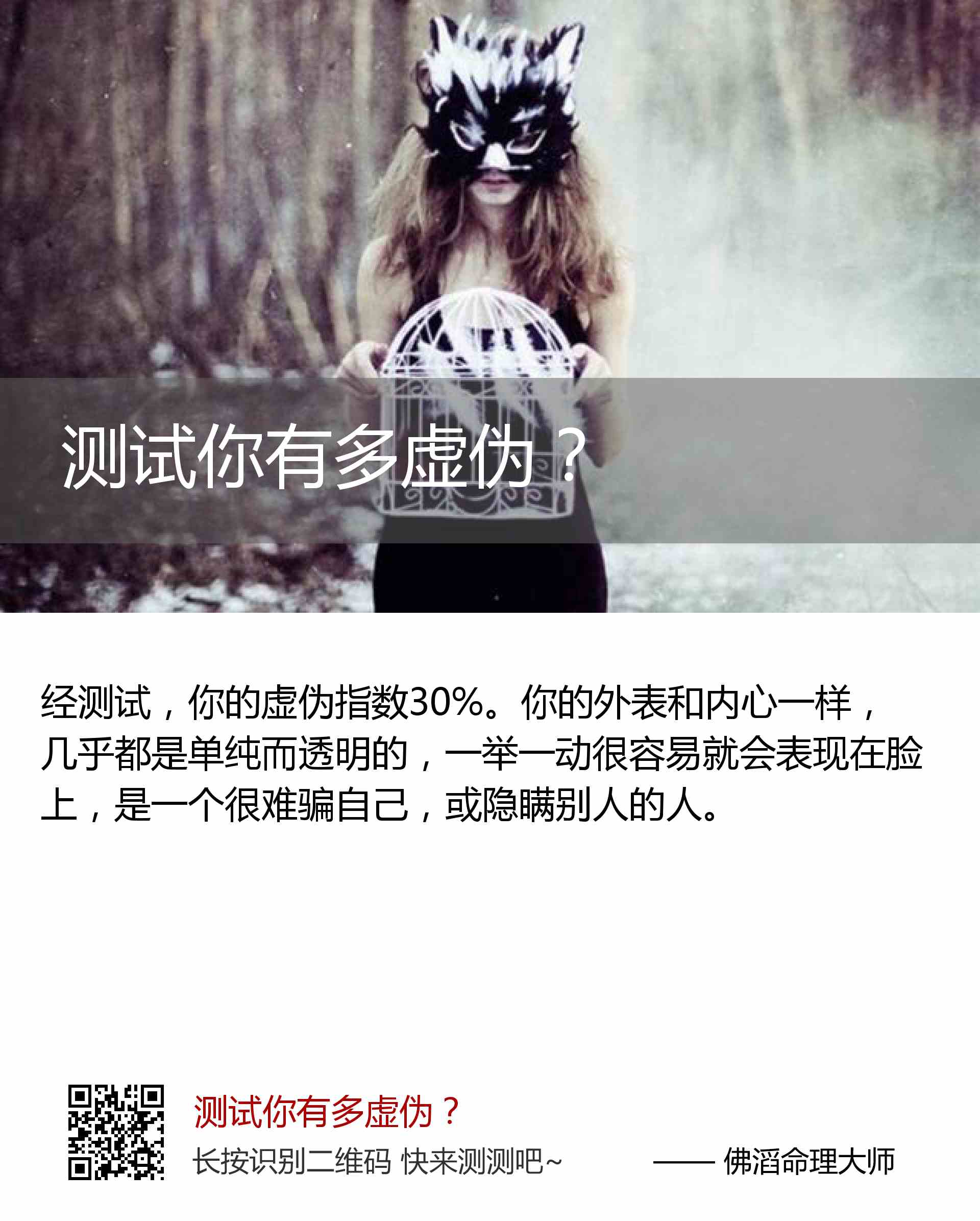 你的外表和内心一样,几乎都是单纯而透明的,一举一动很容易就会表现在脸上,是一个很难骗自己,或隐瞒别人的人。