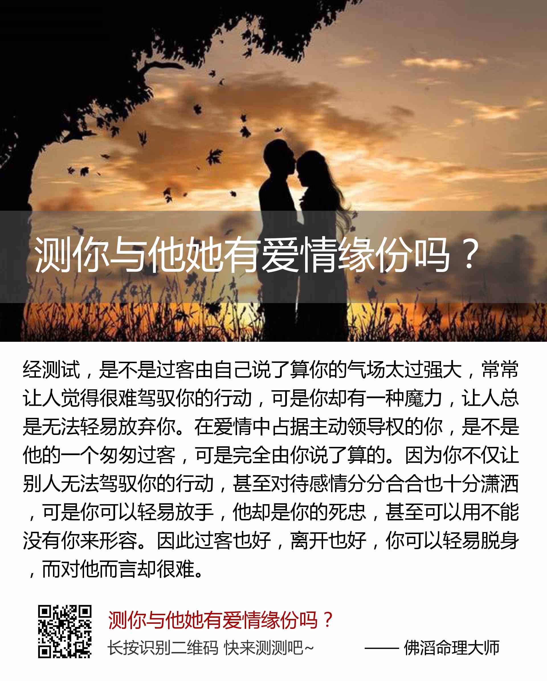 在爱情中占据主动领导权的你,是不是他的一个匆匆过客,可是完全由你说了算的。因为你不仅让别人无法驾驭你的行动,甚至对待感情分分合合也十分潇洒,可是你可以轻易放手,他却是你的死忠,甚至可以用不能没有你来形容。因此过客也好,离开也好,你可以轻易脱身,而对他而言却很难。