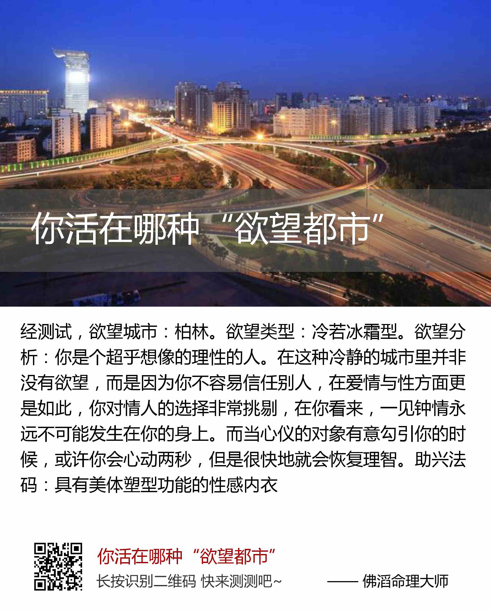 欲望类型:冷若冰霜型。欲望分析:你是个超乎想像的理性的人。在这种冷静的城市里并非没有欲望,而是因为你不容易信任别人,在爱情与性方面更是如此,你对情人的选择非常挑剔,在你看来,一见钟情永远不可能发生在你的身上。而当心仪的对象有意勾引你的时候,或许你会心动两秒,但是很快地就会恢复理智。助兴法码:具有美体塑型功能的性感内衣