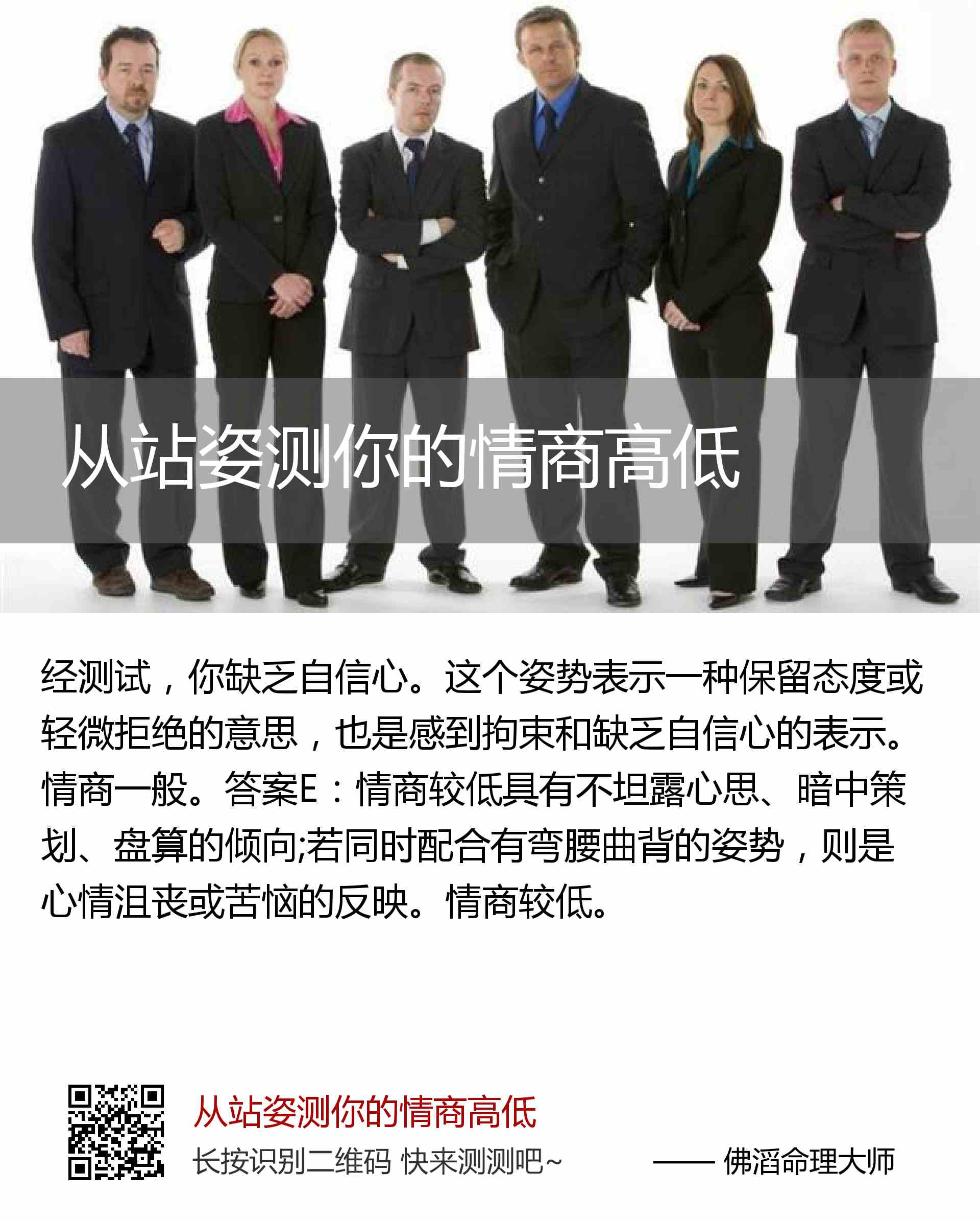 这个姿势表示一种保留态度或轻微拒绝的意思,也是感到拘束和缺乏自信心的表示。情商一般。答案E:情商较低具有不坦露心思、暗中策划、盘算的倾向;若同时配合有弯腰曲背的姿势,则是心情沮丧或苦恼的反映。情商较低。