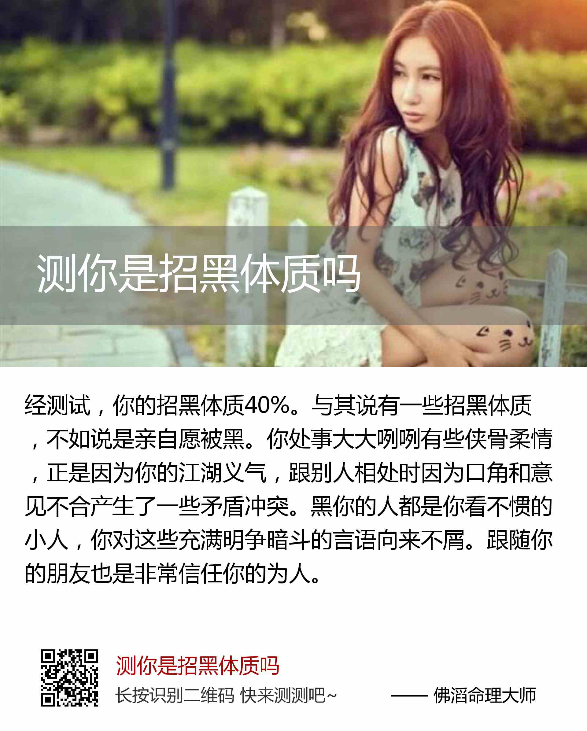 与其说有一些招黑体质,不如说是亲自愿被黑。你处事大大咧咧有些侠骨柔情,正是因为你的江湖义气,跟别人相处时因为口角和意见不合产生了一些矛盾冲突。黑你的人都是你看不惯的小人,你对这些充满明争暗斗的言语向来不屑。跟随你的朋友也是非常信任你的为人。