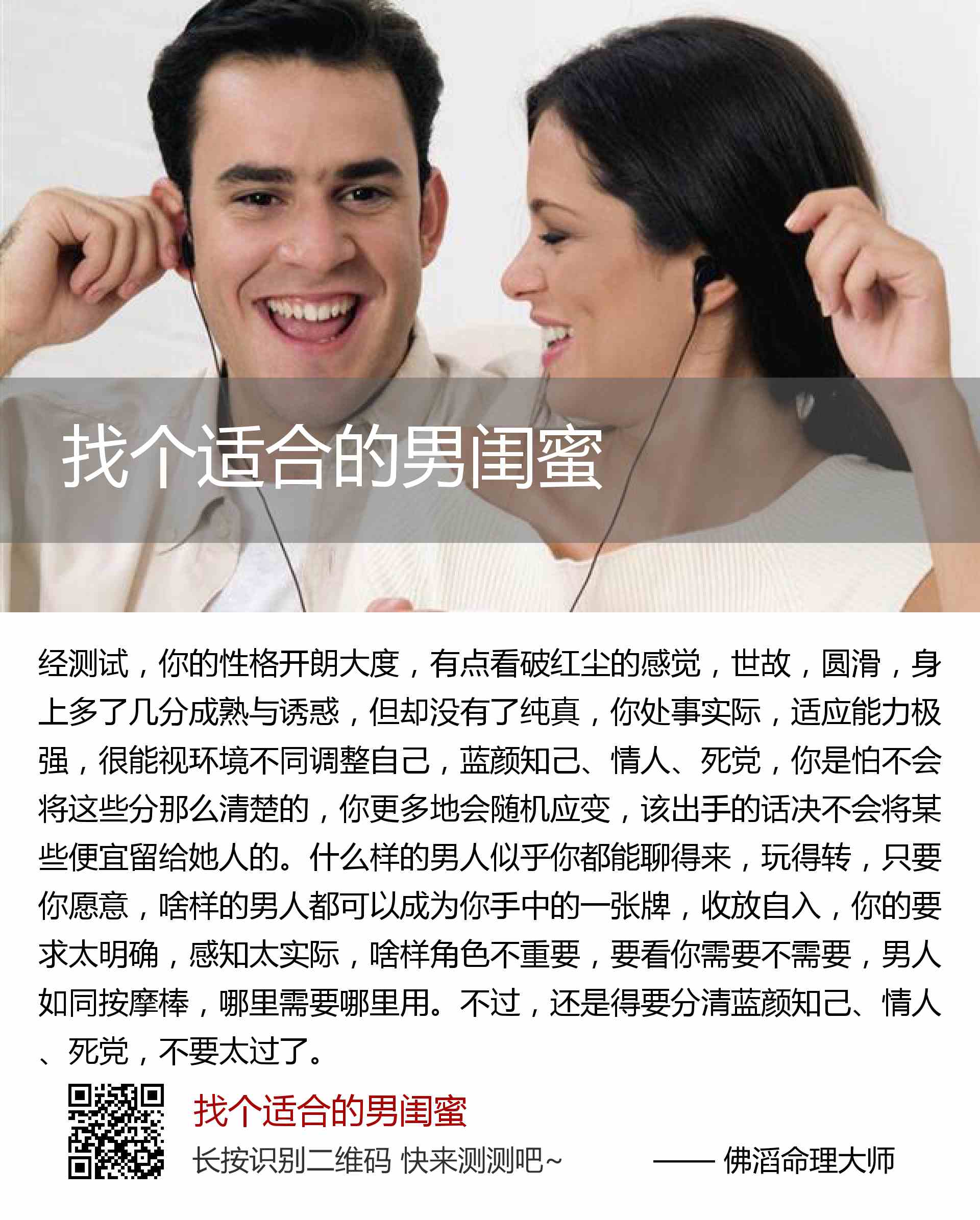 你的性格开朗大度,有点看破红尘的感觉,世故,圆滑,身上多了几分成熟与诱惑,但却没有了纯真,你处事实际,适应能力极强,很能视环境不同调整自己,蓝颜知己、情人、死党,你是怕不会将这些分那么清楚的,你更多地会随机应变,该出手的话决不会将某些便宜留给她人的。