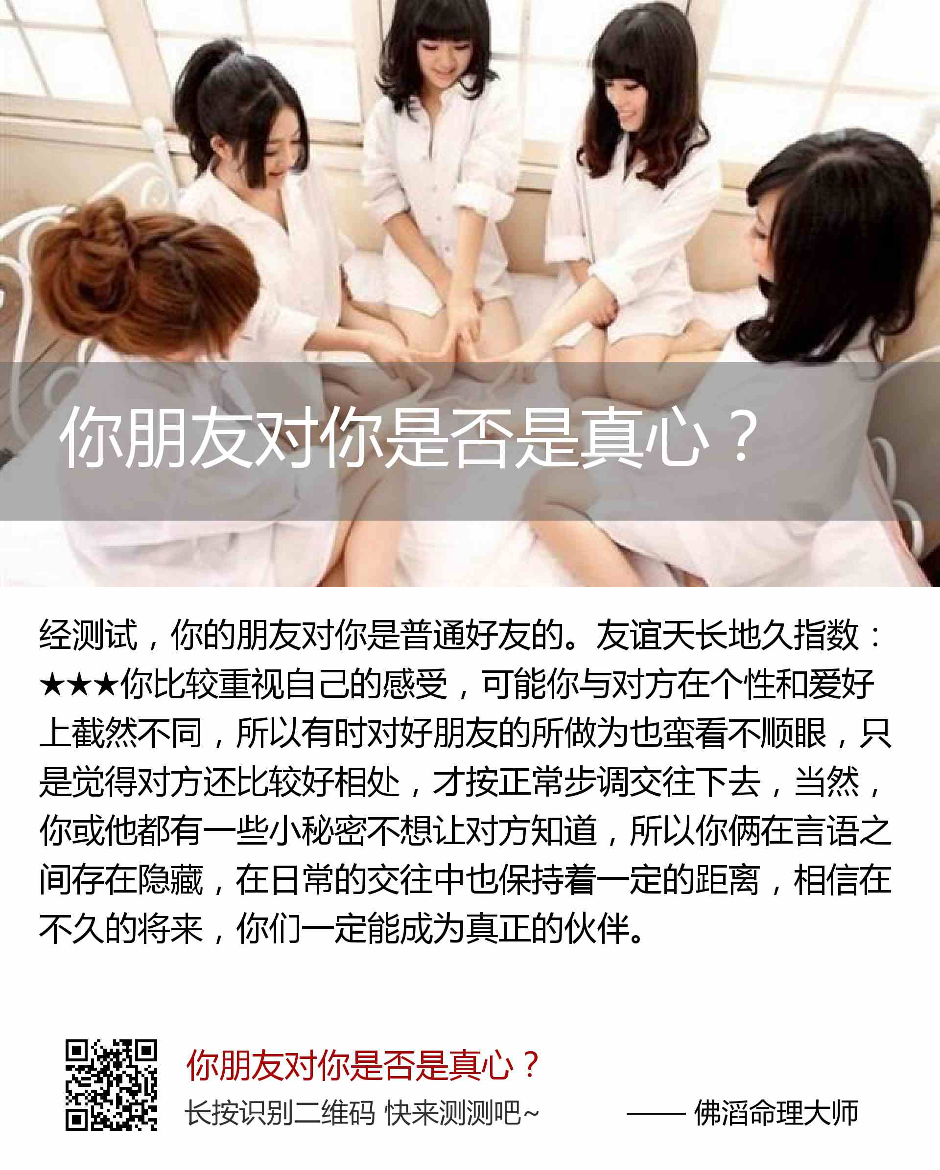 友谊天长地久指数:★★★你比较重视自己的感受,可能你与对方在个性和爱好上截然不同,所以有时对好朋友的所做为也蛮看不顺眼,只是觉得对方还比较好相处,才按正常步调交往下去,当然,你或他都有一些小秘密不想让对方知道,所以你俩在言语之间存在隐藏,在日常的交往中也保持着一定的距离,相信在不久的将来,你们一定能成为真正的伙伴。