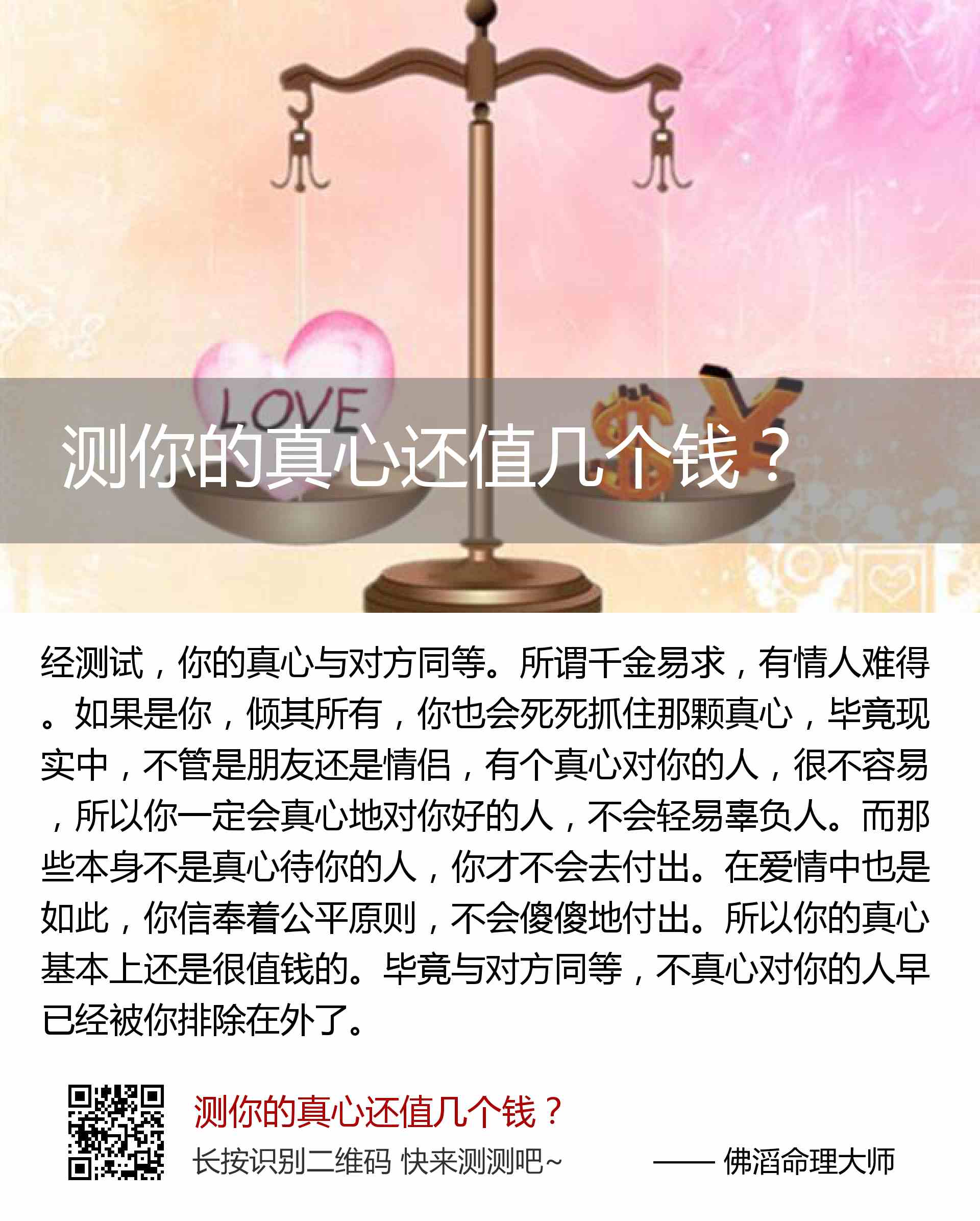 所谓千金易求,有情人难得。如果是你,倾其所有,你也会死死抓住那颗真心,毕竟现实中,不管是朋友还是情侣,有个真心对你的人,很不容易,所以你一定会真心地对你好的人,不会轻易辜负人。而那些本身不是真心待你的人,你才不会去付出。在爱情中也是如此,你信奉着公平原则,不会傻傻地付出。所以你的真心基本上还是很值钱的。毕竟与对方同等,不真心对你的人早已经被你排除在外了。