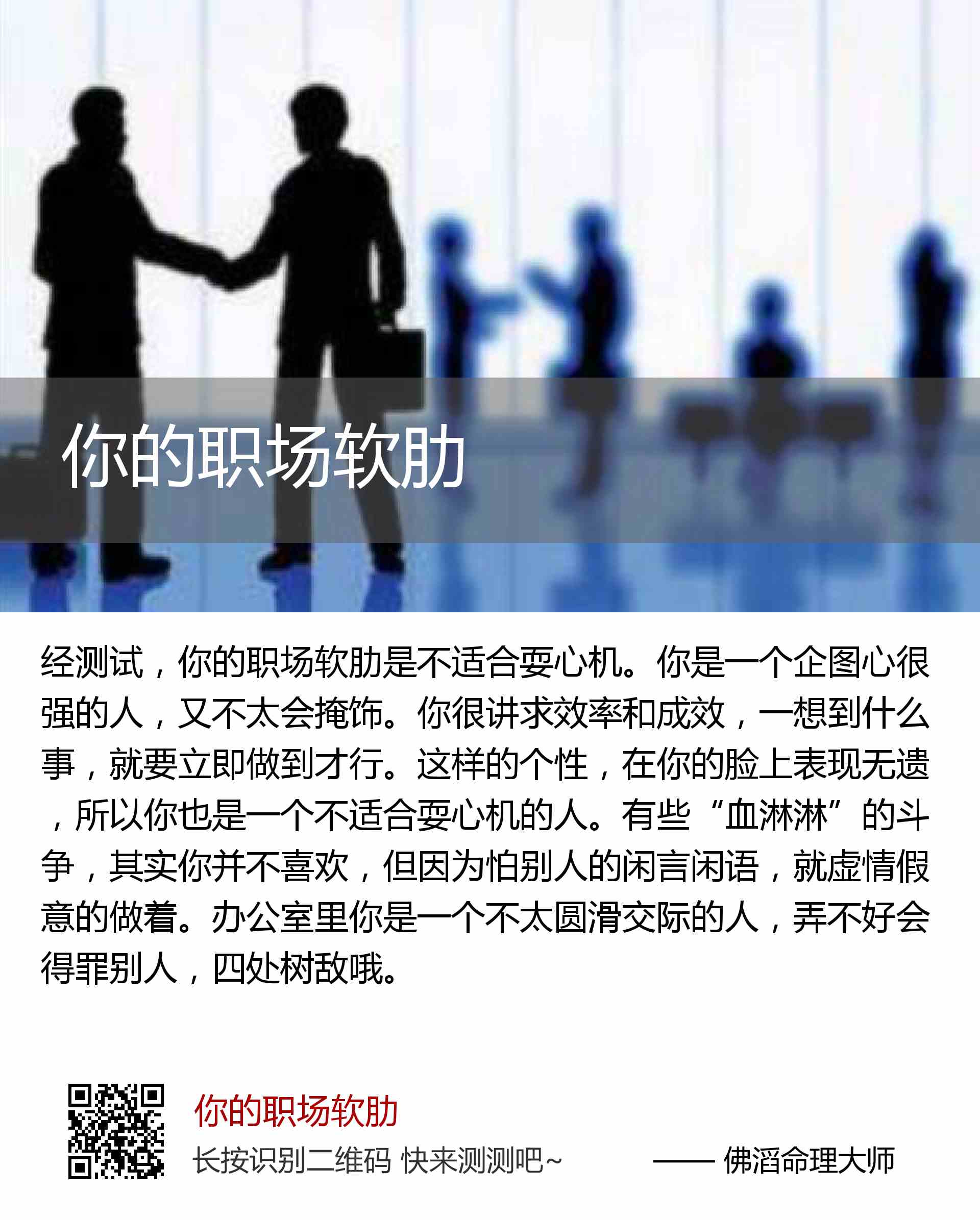 你是一个企图心很强的人,又不太会掩饰。你很讲求效率和成效,一想到什么事,就要立即做到才行。这样的个性,在你的脸上表现无遗,所以你也是一个不适合耍心机的人。有些“血淋淋”的斗争,其实你并不喜欢,但因为怕别人的闲言闲语,就虚情假意的做着。办公室里你是一个不太圆滑交际的人,弄不好会得罪别人,四处树敌哦。