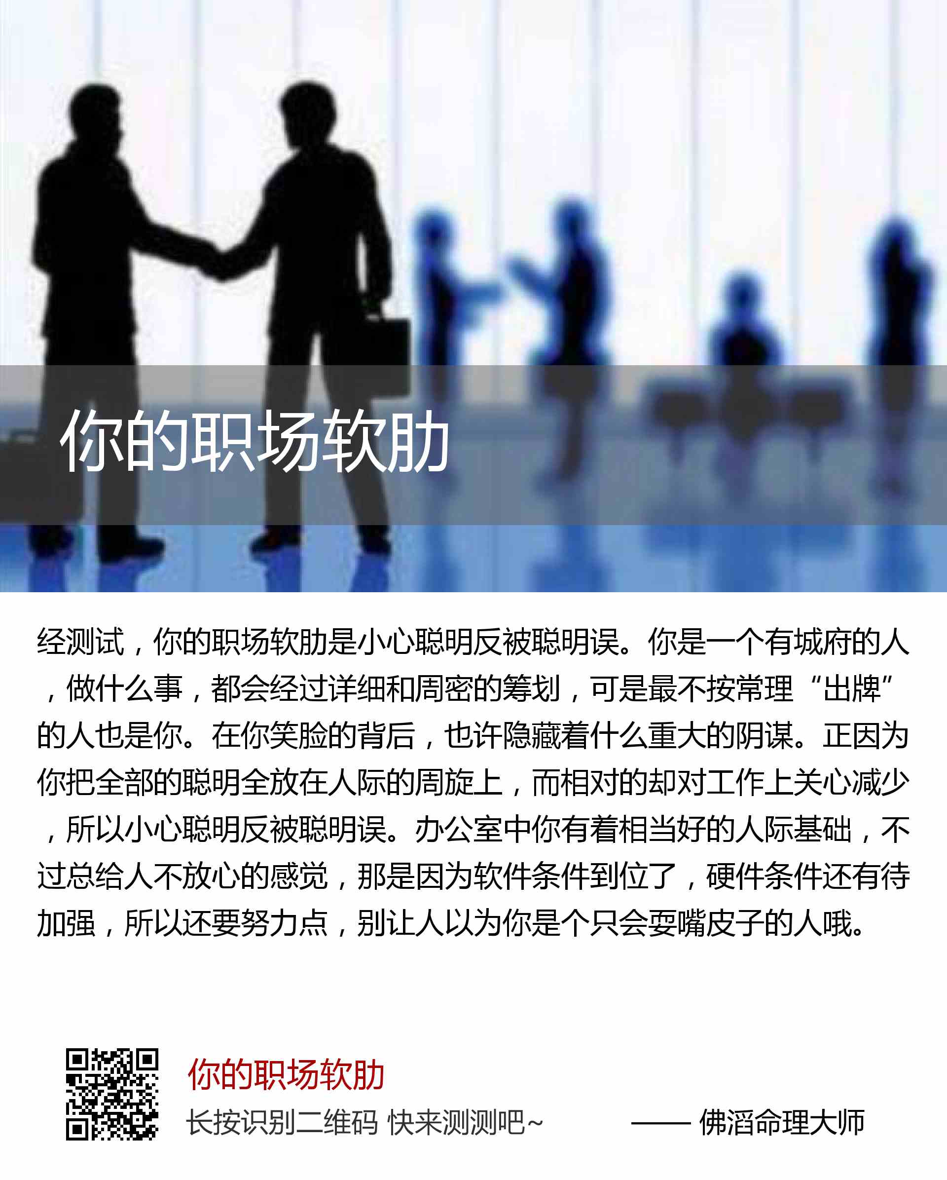 你是一个有城府的人,做什么事,都会经过详细和周密的筹划,可是最不按常理“出牌”的人也是你。在你笑脸的背后,也许隐藏着什么重大的阴谋。正因为你把全部的聪明全放在人际的周旋上,而相对的却对工作上关心减少,所以小心聪明反被聪明误。办公室中你有着相当好的人际基础,不过总给人不放心的感觉,那是因为软件条件到位了,硬件条件还有待加强,所以还要努力点,别让人以为你是个只会耍嘴皮子的人哦。