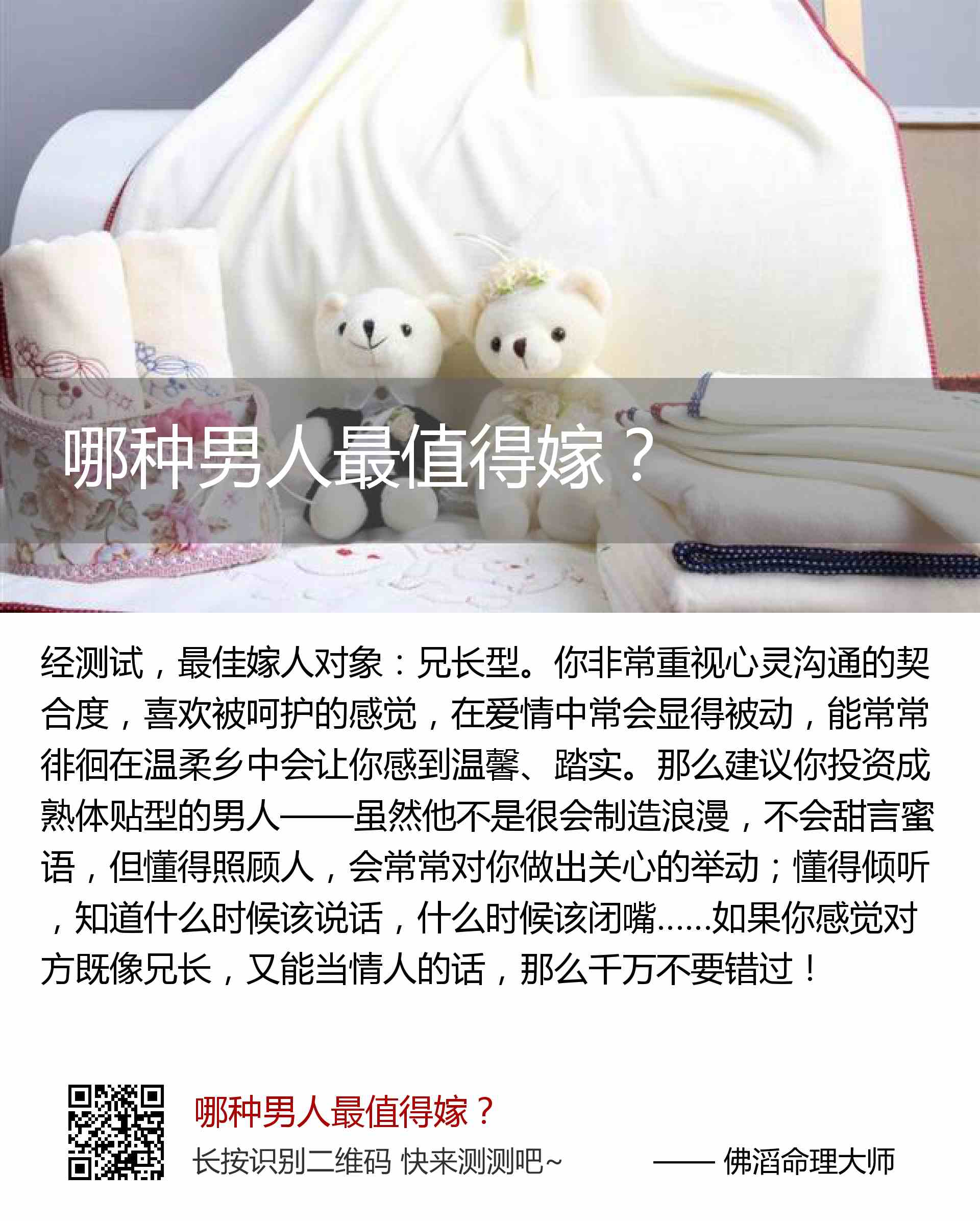你非常重视心灵沟通的契合度,喜欢被呵护的感觉,在爱情中常会显得被动,能常常徘徊在温柔乡中会让你感到温馨、踏实。那么建议你投资成熟体贴型的男人——虽然他不是很会制造浪漫,不会甜言蜜语,但懂得照顾人,会常常对你做出关心的举动;懂得倾听,知道什么时候该说话,什么时候该闭嘴……如果你感觉对方既像兄长,又能当情人的话,那么千万不要错过!