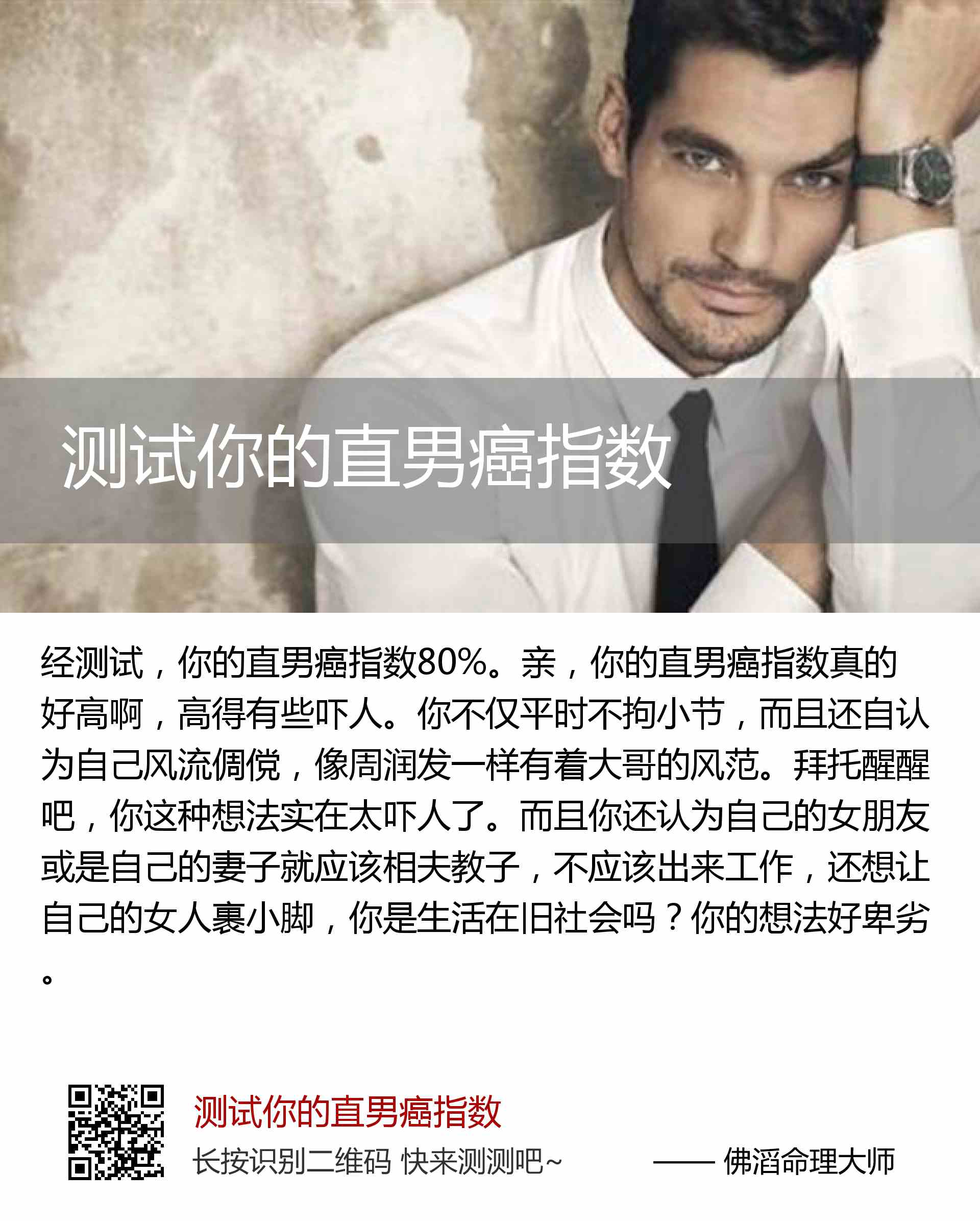 亲,你的直男癌指数真的好高啊,高得有些吓人。你不仅平时不拘小节,而且还自认为自己风流倜傥,像周润发一样有着大哥的风范。拜托醒醒吧,你这种想法实在太吓人了。而且你还认为自己的女朋友或是自己的妻子就应该相夫教子,不应该出来工作,还想让自己的女人裹小脚,你是生活在旧社会吗?你的想法好卑劣。