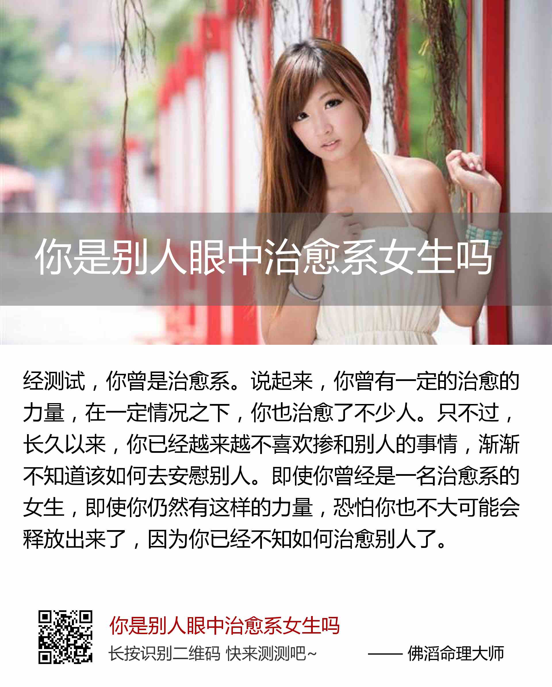 说起来,你曾有一定的治愈的力量,在一定情况之下,你也治愈了不少人。只不过,长久以来,你已经越来越不喜欢掺和别人的事情,渐渐不知道该如何去安慰别人。即使你曾经是一名治愈系的女生,即使你仍然有这样的力量,恐怕你也不大可能会释放出来了,因为你已经不知如何治愈别人了。
