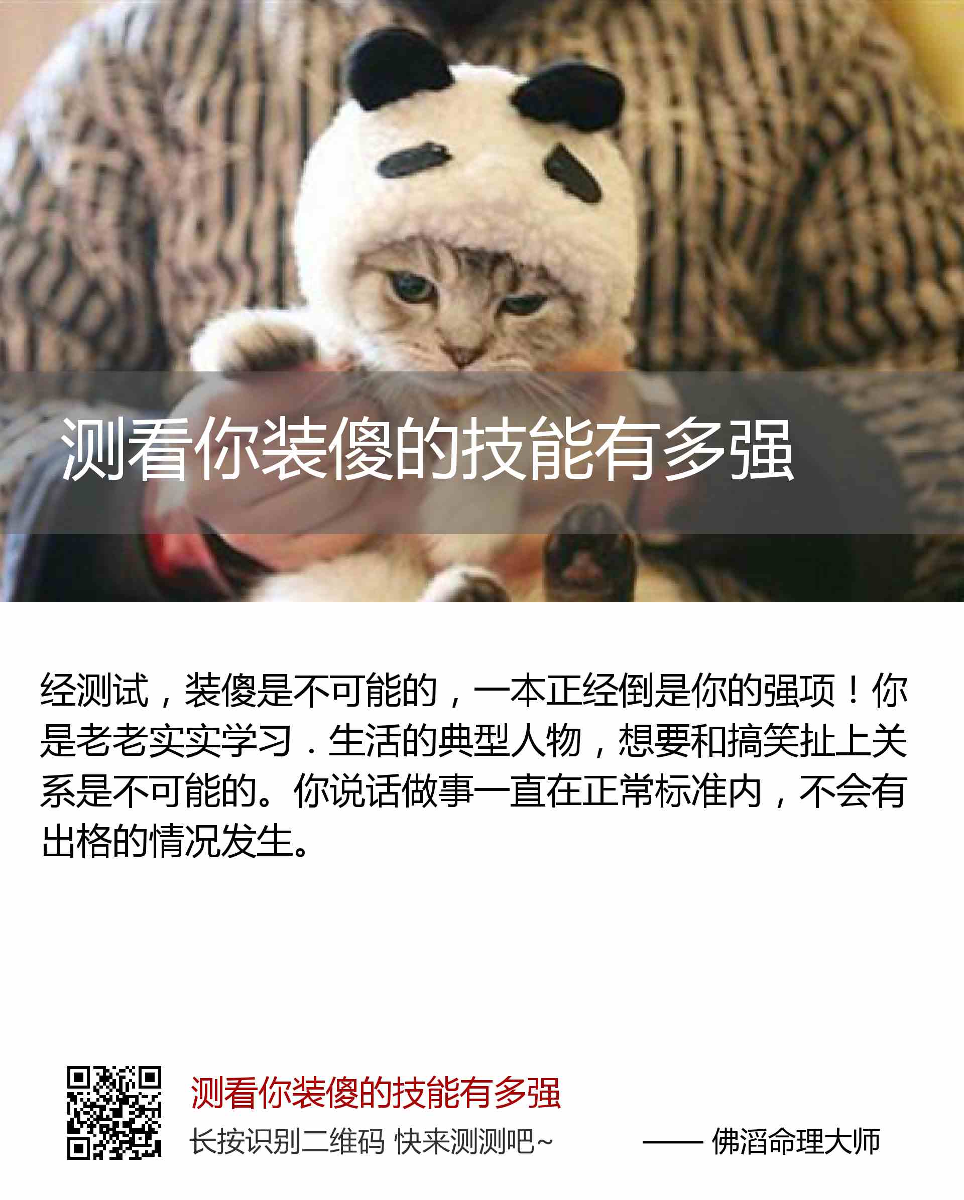 装傻是不可能的,一本正经倒是你的强项!你是老老实实学习.生活的典型人物,想要和搞笑扯上关系是不可能的。